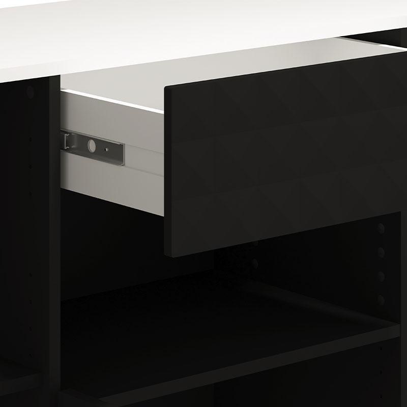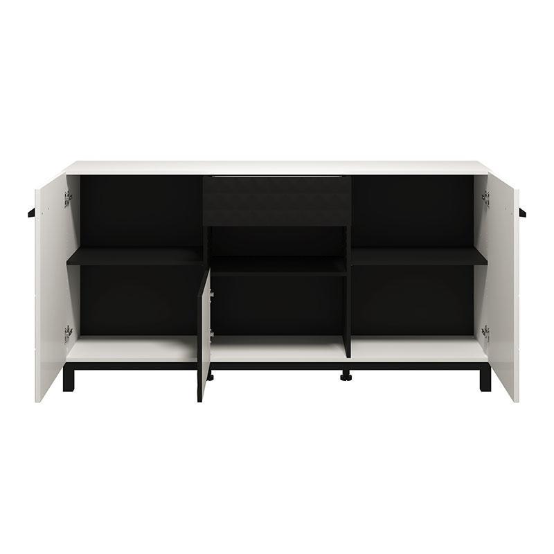 Η κομότα διαθέτει τρία ντουλάπια και ένα συρτάρι με εσωτερικούς χώρους για να οργανώσετε τα αντικείμενα σας με πρακτικότητα και στυλ. Η χρήση μοριοσανίδας με πιστοποιημένη επικάλυψη μελαμίνης Ε1, σε συνδυασμό με τις μαύρες χειρολαβές, διασφαλίζουν τη μακροχρόνια ανθεκτικότητα και λειτουργικότητα του προϊόντος. Το φινίρισμα λευκού και μαύρου ματ δημιουργεί μια ήρεμη και κομψή ατμόσφαιρα, η οποία ταιριάζει εύκολα με διάφορα στυλ διακόσμησης.