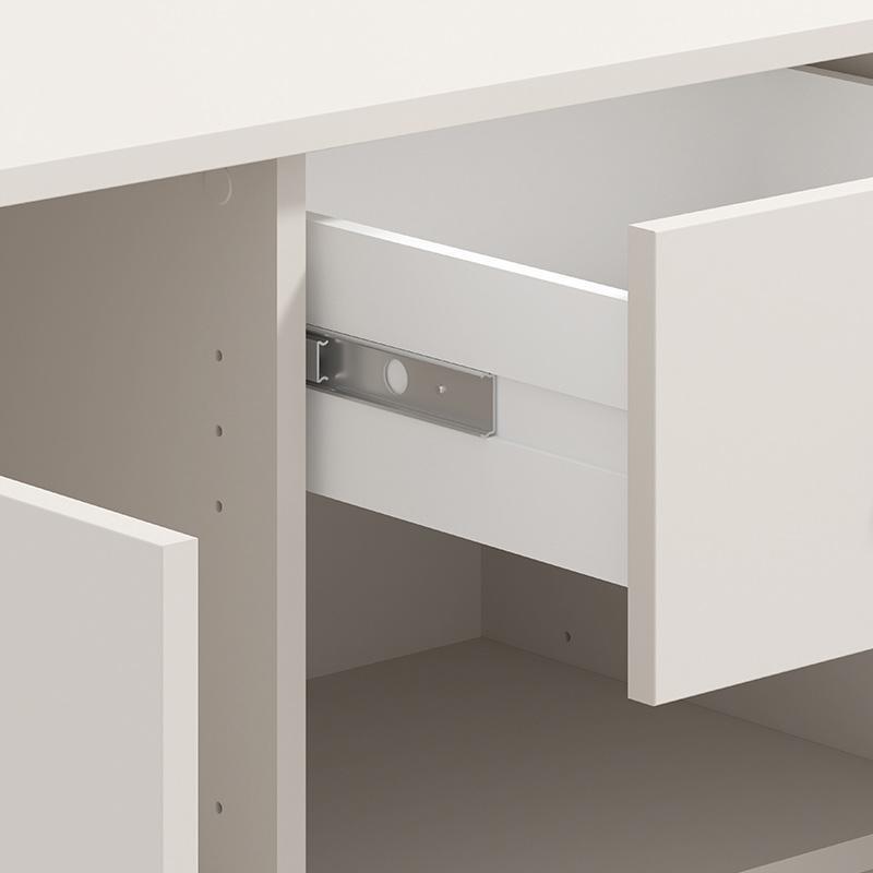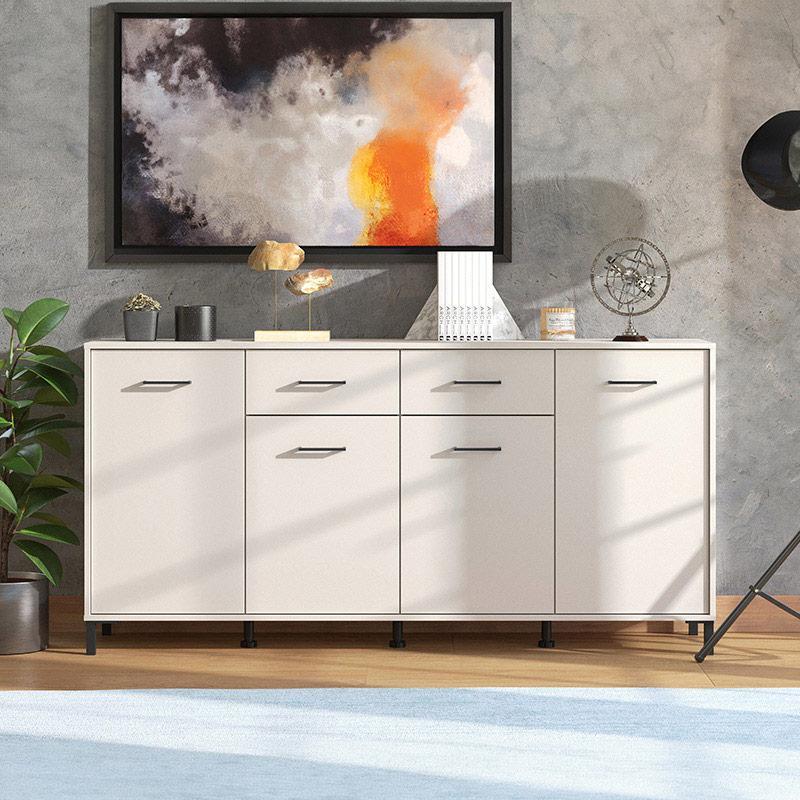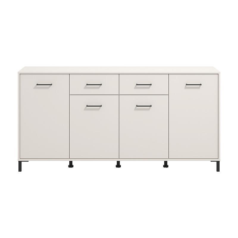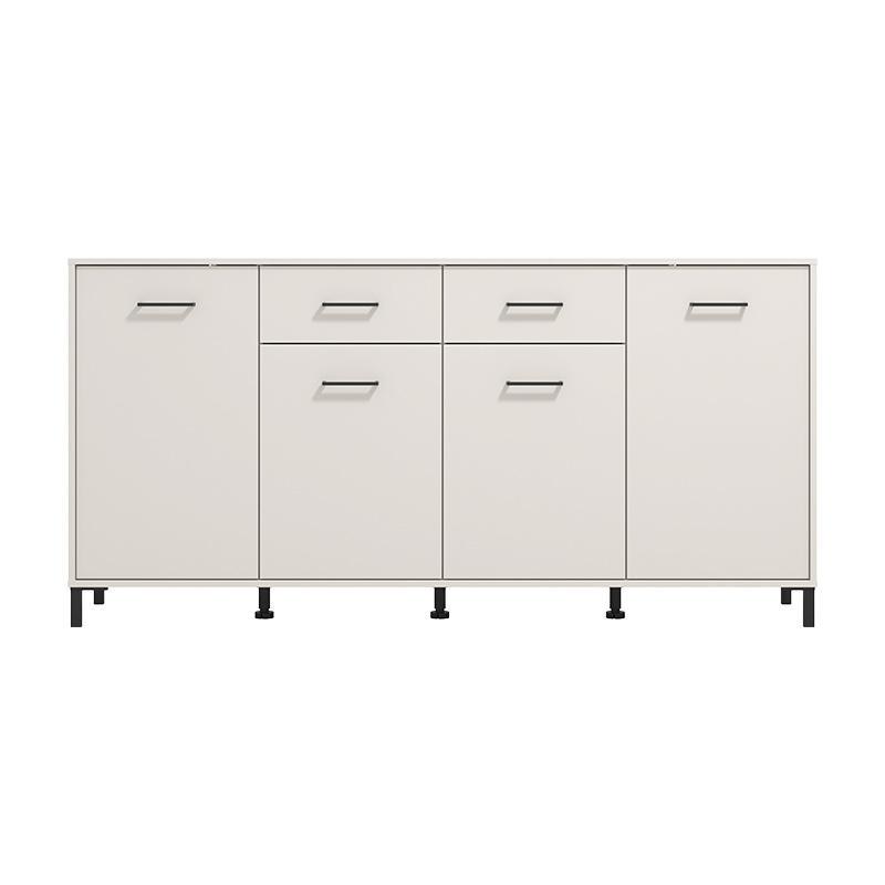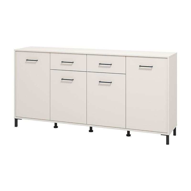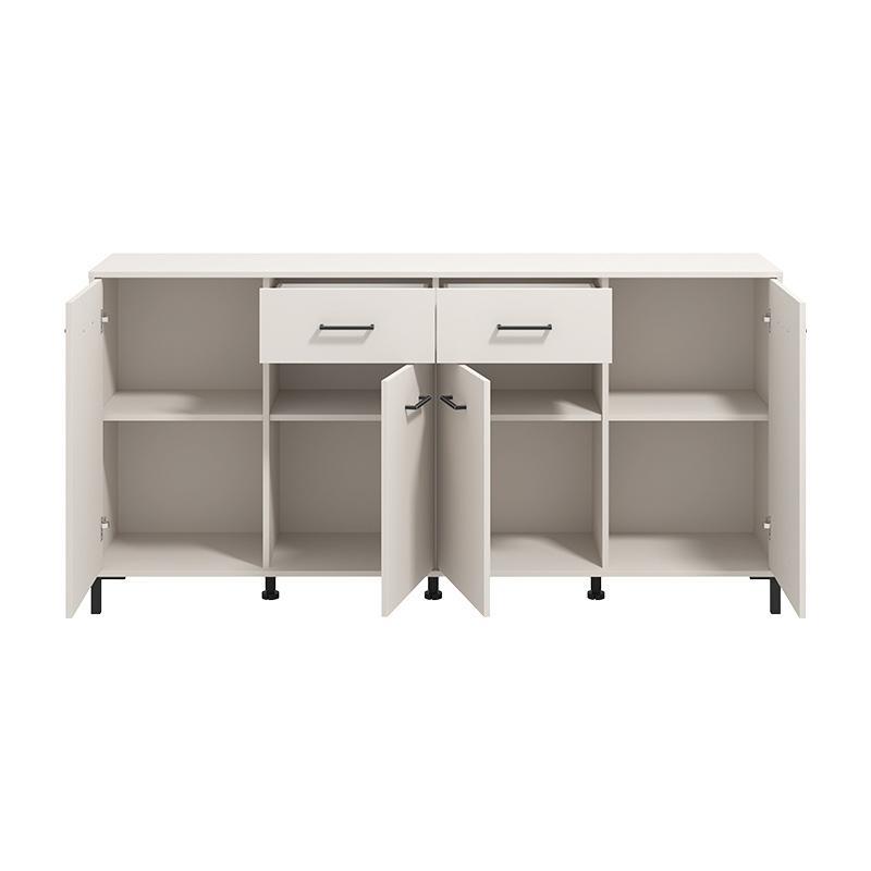 Η κομότα διαθέτει τέσσερα (4) ντουλάπιακαι δύο (2) συρτάρια, προσφέροντας αρκετό αποθηκευτικό χώρο για διάφορα αντικείμενα, ενώ η πλαστική χειρολαβή αλουμινίου προσφέρει μια μοντέρνα αίσθηση. Η κατασκευή της είναι από μοριοσανίδα με πιστοποιημένη επικάλυψη μελαμίνης Ε1, που εξασφαλίζει μακροχρόνια ανθεκτικότητα και ευκολία στην συντήρηση.