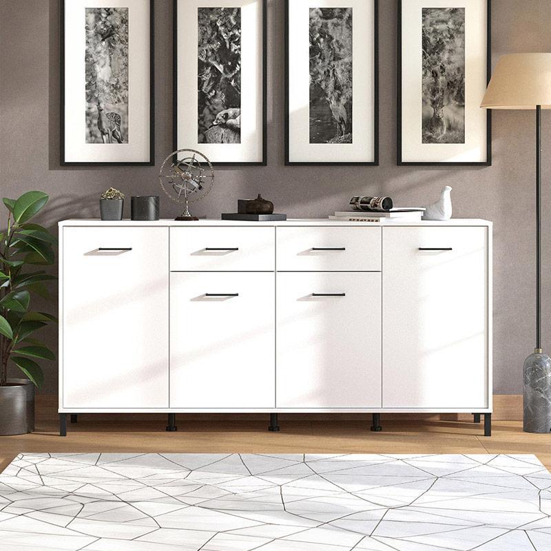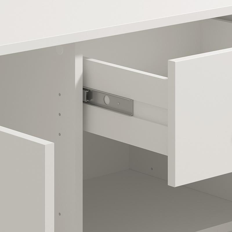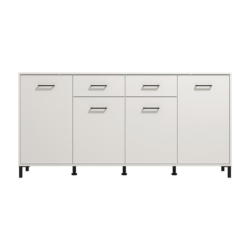 Η κομότα διαθέτει τέσσερα (4) ντουλάπιακαι δύο (2) συρτάρια, προσφέροντας αρκετό αποθηκευτικό χώρο για διάφορα αντικείμενα, ενώ η πλαστική χειρολαβή αλουμινίου προσφέρει μια μοντέρνα αίσθηση. Η κατασκευή της είναι από μοριοσανίδα με πιστοποιημένη επικάλυψη μελαμίνης Ε1, που εξασφαλίζει μακροχρόνια ανθεκτικότητα και ευκολία στην συντήρηση.