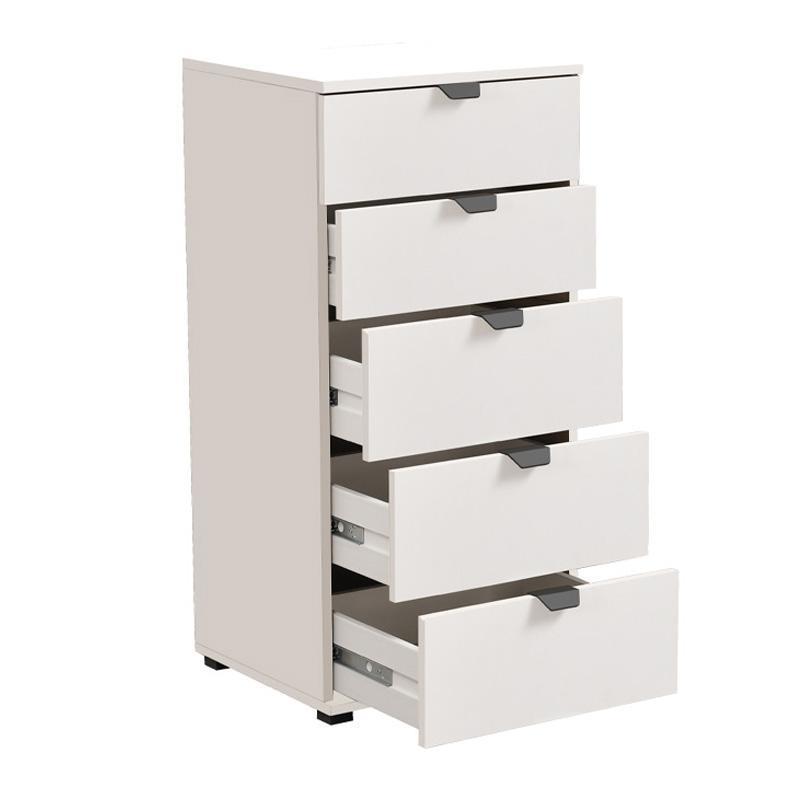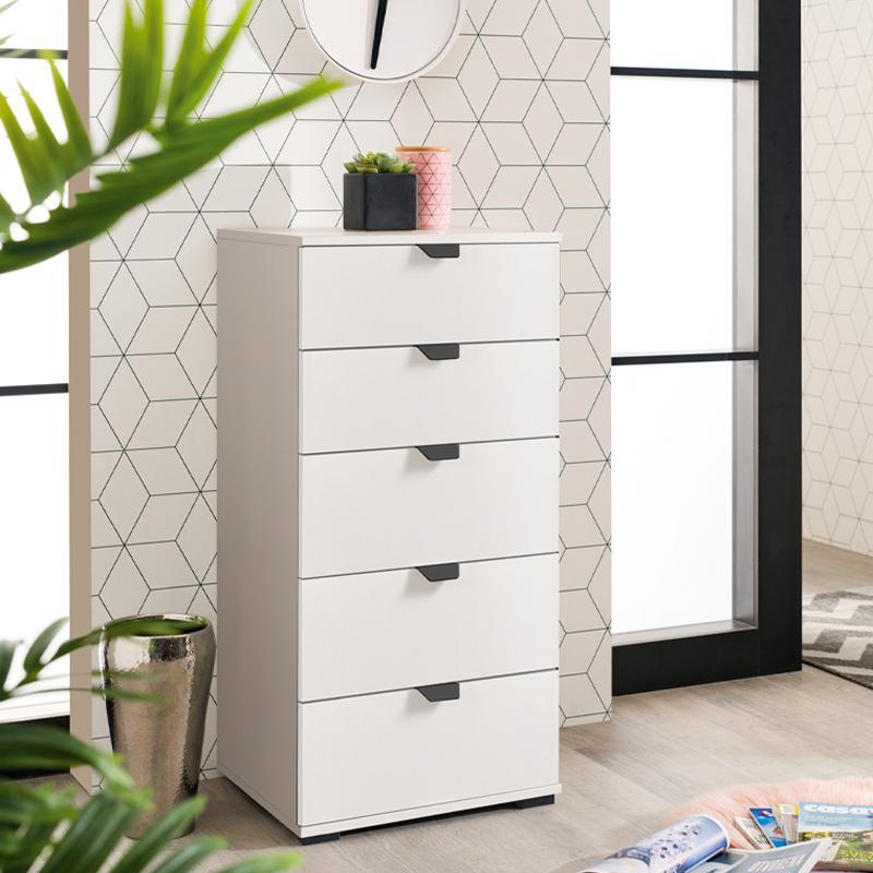 Με πέντε ευρύχωρα συρτάρια, η συρταριέρα κρεβατοκάμαρας Duero, σας επιτρέπει να αποθηκεύσετε τα προσωπικά σας αντικείμενα, όπως ρούχα, εσώρουχα, αξεσουάρ ή ακόμη και έγγραφα, κρατώντας τα οργανωμένα και εύκολα προσβάσιμα και με το μικρό πλάτος αποτελεί ιδανική επιλογή για κάθε μικρό και στενό χώρο.