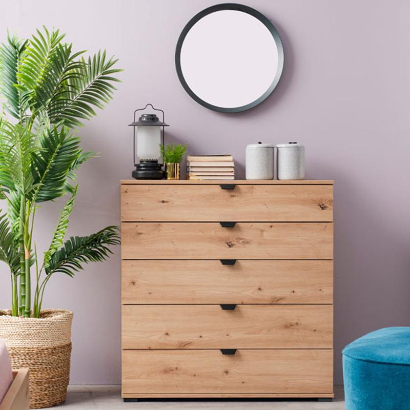 Με πέντε μεγάλα συρτάρια, η συρταριέρα κρεβατοκάμαρας Duero, σας επιτρέπει να αποθηκεύσετε τα προσωπικά σας αντικείμενα, όπως ρούχα, εσώρουχα, αξεσουάρ ή ακόμη και έγγραφα, κρατώντας τα οργανωμένα και εύκολα προσβάσιμα.
