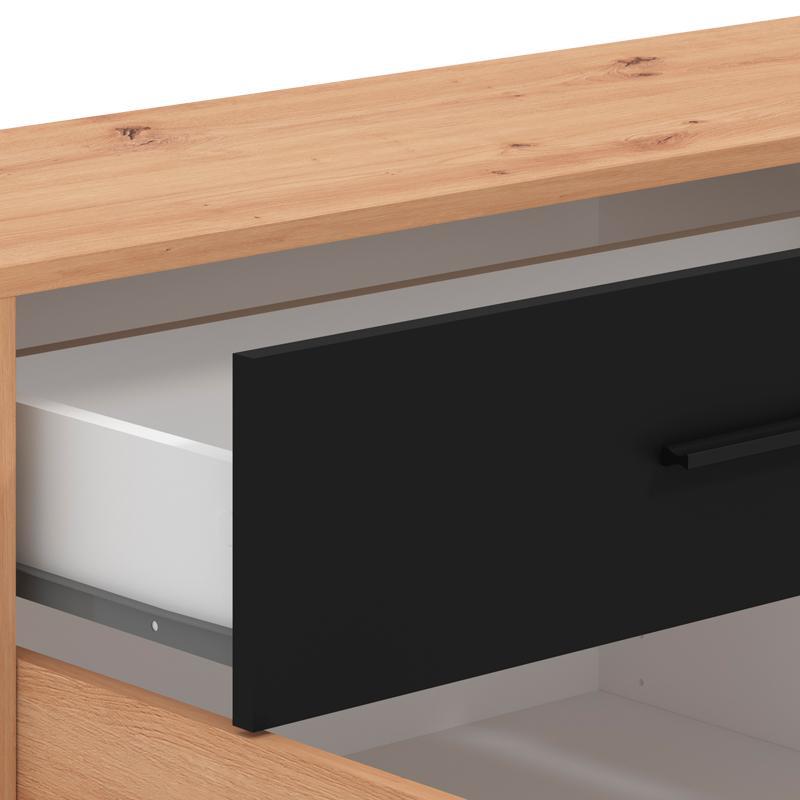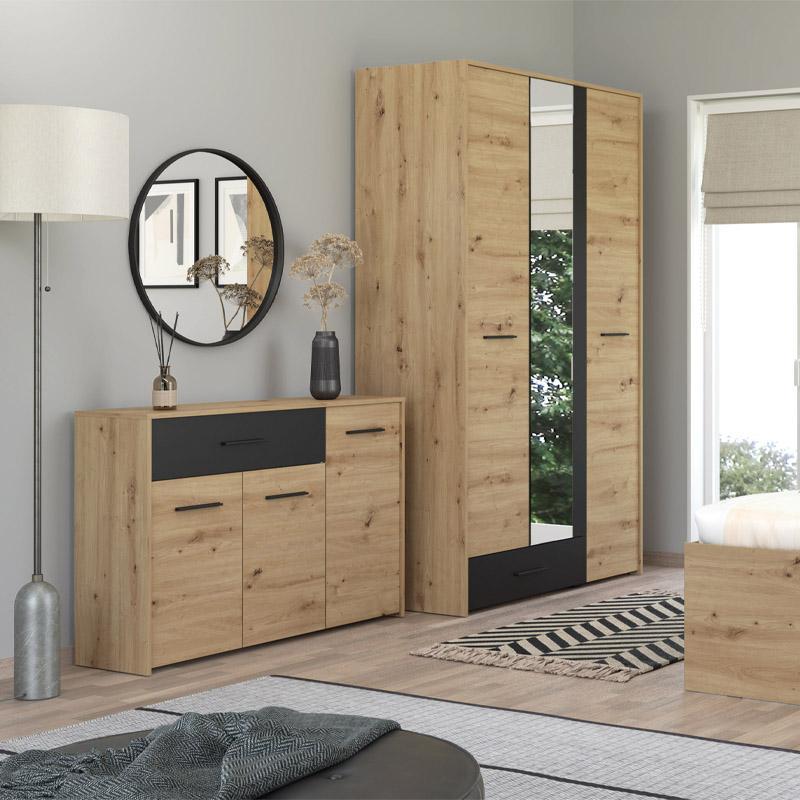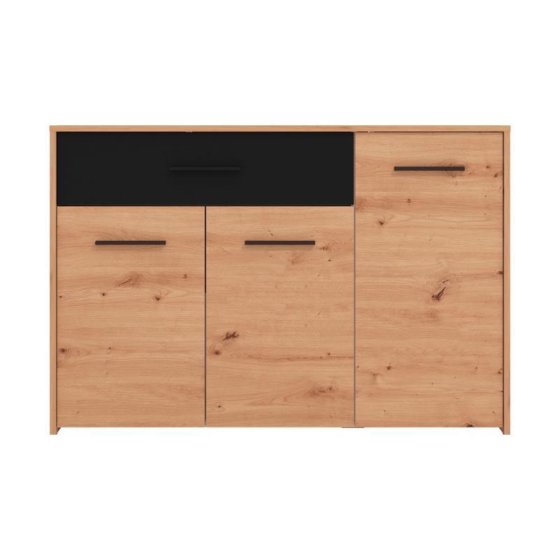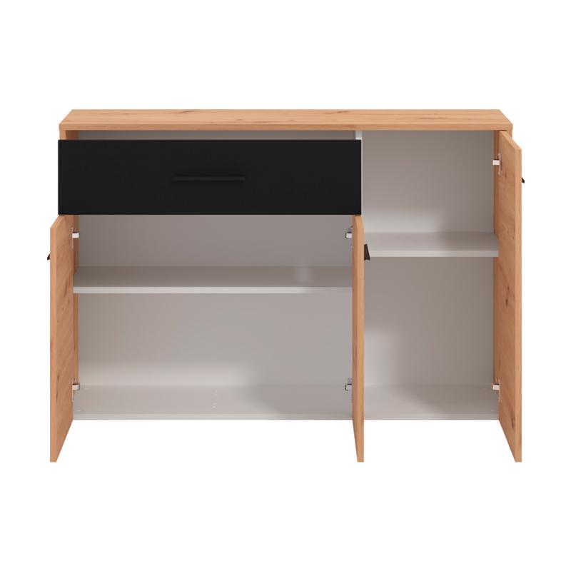 Η κομότα Varadero της ομώνυμης συλλογής είναι το ιδανικό έπιπλο για να ολοκληρώσετε τη διακόσμηση του δωματίου σας. Συνδυάζει λειτουργικότητα και μοντέρνο σχεδιασμό, προσφέροντας ευρύχωρο αποθηκευτικό χώρο για προσωπικά αντικείμενα, ρούχα ή αξεσουάρ. Με ένα συρτάρι και τρία ευρύχωρα ντουλάπια, η κομότα Varadero εξυπηρετεί τις ανάγκες αποθήκευσης χωρίς να θυσιάζει την αισθητική του χώρου. Το artisan oak και μαύρο χρώμα του δημιουργεί μια σύγχρονη και κομψή ατμόσφαιρα, που ταιριάζει απόλυτα σε κάθε δωμάτιο, είτε πρόκειται για το σαλόνι, το υπνοδωμάτιο, ή τον διάδρομο.