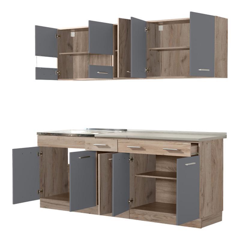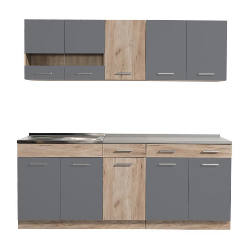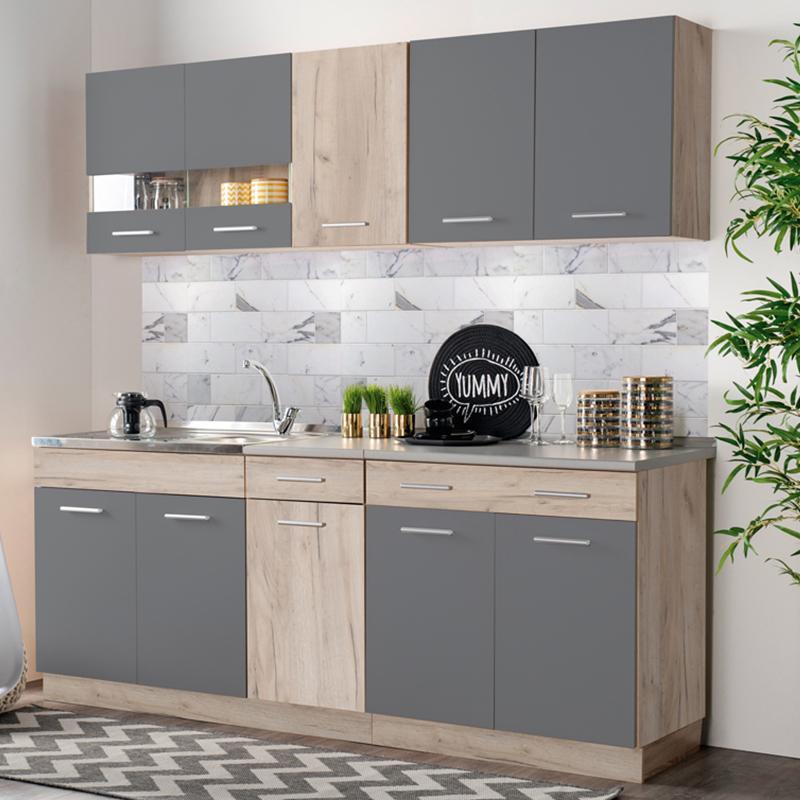 Η σύνθεση κουζίνας Dalila 200 συνδυάζει την κομψότητα του grey oak με το σύγχρονο ύφος του γκρι γραφίτη, αποτελώντας μια ιδανική επιλογή για κάθε μοντέρνο χώρο. Ο σχεδιασμός της ξεχωρίζει για τη λειτουργικότητα και την αισθητική, με δύο ημι-γυάλινες πόρτες στο κρεμαστό ντουλάπι κουζίνας που προσδίδει διαχρονική φινέτσα και φωτεινότητα στον χώρο. Παράλληλα, το μεγάλο συρτάρι στο επιδαπέδιο ντουλάπι εξασφαλίζει επιπλέον αποθηκευτικό χώρο, διατηρώντας τα σκεύη και τα αξεσουάρ κουζίνας πάντα οργανωμένα. Κατασκευασμένη με ποιοτικά υλικά, η έτοιμη σύνθεση κουζίνας Dalila 200 αποτελεί μια κομψή και πρακτική λύση που ταιριάζει σε κάθε μοντέρνα διακόσμηση κουζίνας.