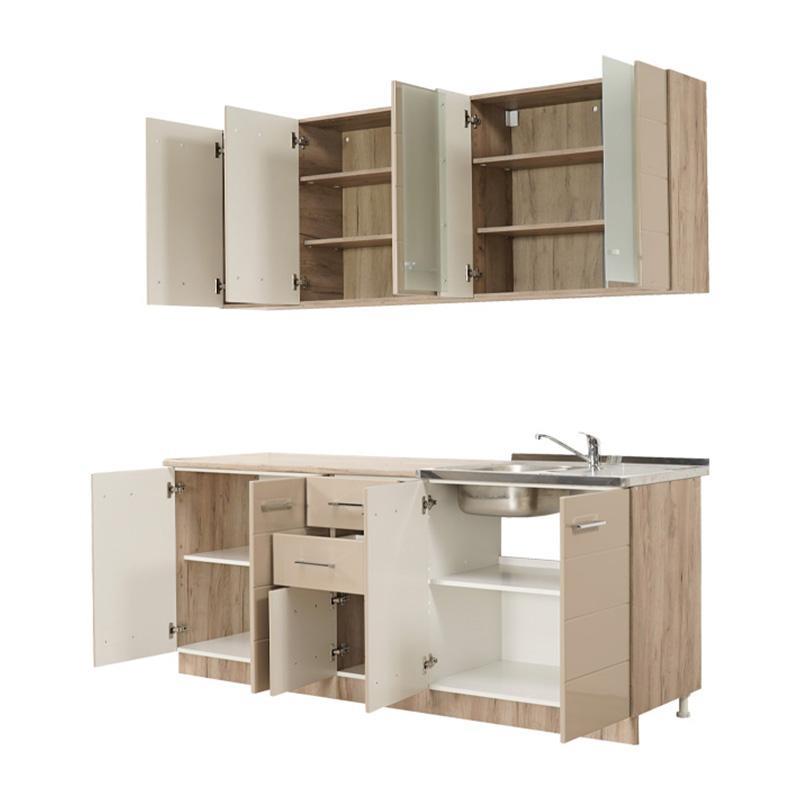 Η έτοιμη σύνθεση κουζίνας Diana 200 σε απόχρωση Άμμου Γυαλιστερό σε συνδυασμό με το Grey oak σώμα του, συνδυάζει κομψότητα και λειτουργικότητα, αποτελώντας μια εξαιρετική επιλογή για κάθε σύγχρονο χώρο. Σχεδιασμένη για να καλύπτει κάθε αισθητική και πρακτική ανάγκη σας, αυτή η σύνθεση κουζίνας προσφέρει πολλούς χώρους αποθήκευσης, με 3 κρεμαστά ντουλάπια καθώς και τρία επιδαπέδια ντουλάπια, από τα οποία το ένα διαθέτει 3 συρτάρια με μηχανισμούς soft close ενώ το άλλο είναι ειδικά κατασκευασμένο για τοποθέτηση του νεροχύτη.