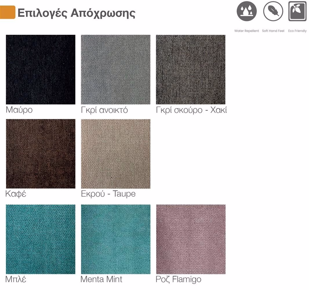 - 8 επιλογές απόχρωσης υφάσματος: Μαύρο, Γκρί ανοικτό, Γκρί σκούρο - Χακί, Καφέ, Εκρού - Taupe, Μπλέ, Menta Mint, Ροζ Flamingo.