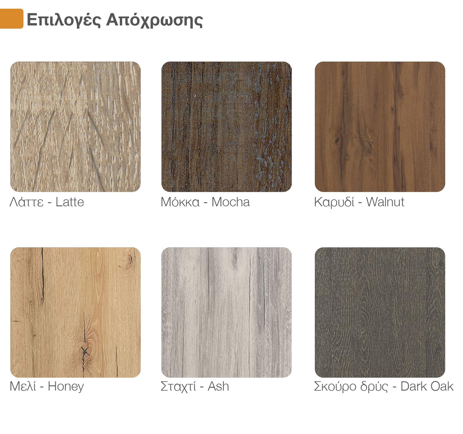 - 6 επιλογές απόχρωσης ξύλου: Λάττε, Μόκκα, Μελί, Σταχτί, Καρυδί & Σκούρο Δρύς