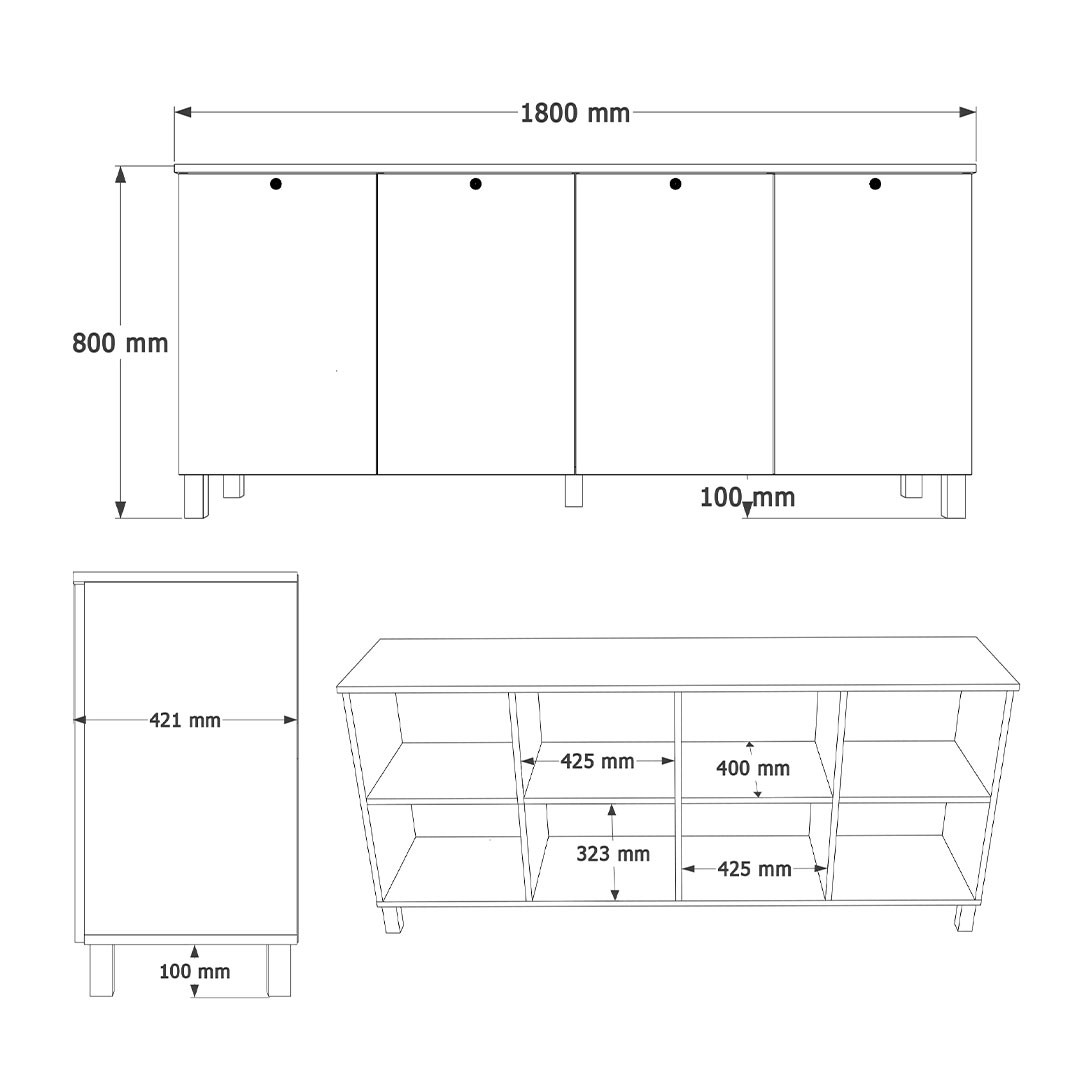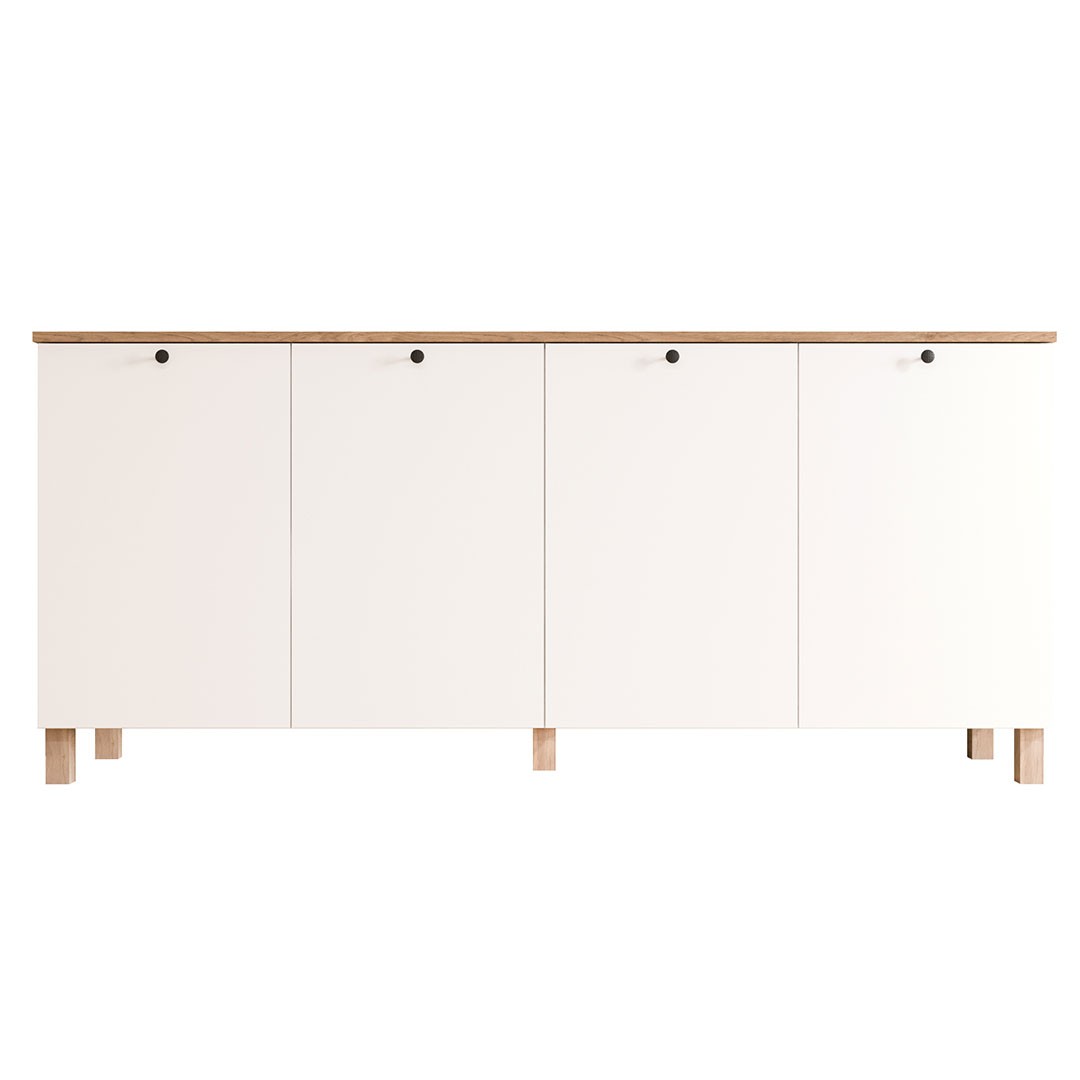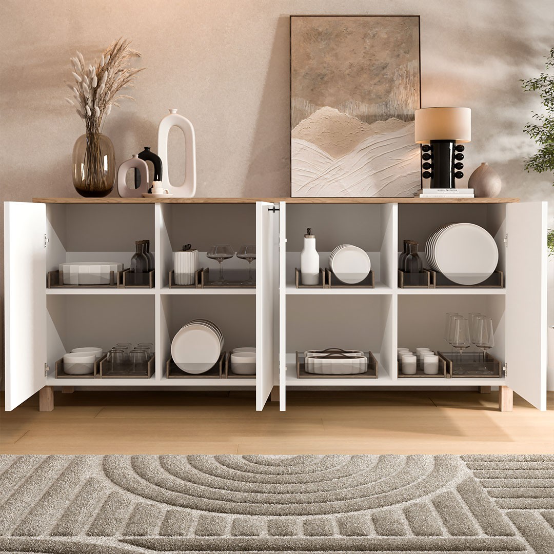 Ο μπουφές διαθέτει τέσσερις ευρύχωρες πόρτες-ντουλάπια, στο εσωτερικό των οποίων υπάρχουν πρακτικά ράφια για σωστή οργάνωση σερβίτσιων, λευκών ειδών ή άλλων αντικειμένων της καθημερινότητας. Τα όμορφα μεταλλικά χερούλια σε μαύρο χρώμα προσθέτουν μια σύγχρονη αντίθεση και αναδεικνύουν τον χαρακτήρα του επίπλου, δίνοντας μια διακριτική industrial πινελιά στο συνολικό design. Κατασκευασμένος από μελαμίνη πάχους 18 χιλιοστών, προσφέρει ανθεκτικότητα, σταθερότητα και πρακτικότητα στην καθημερινή χρήση.