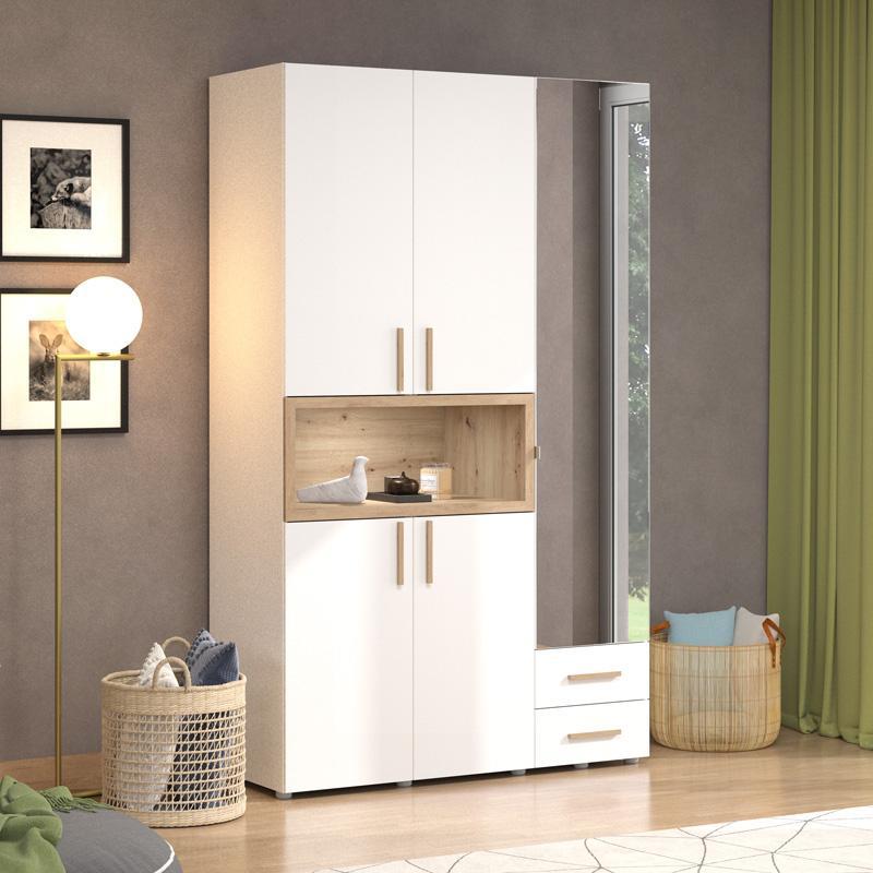 Η κομψή διχρωμία λευκού με artisan oak δημιουργεί μια αρμονική αντίθεση που αποπνέει ζεστασιά και μοντέρνο χαρακτήρα, ταιριάζοντας εύκολα σε διαφορετικά διακοσμητικά στυλ. Ο ολόσωμος καθρέπτης, που διαθέτει στο δεξί της φύλλο, ενσωματώνεται διακριτικά στον σχεδιασμό, προσθέτοντας πρακτικότητα αλλά και φωτεινότητα στο χώρο καθώς διαχέει το φώς.