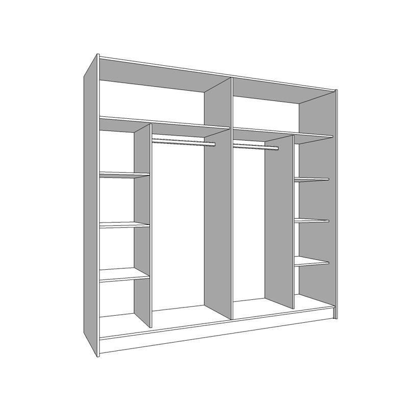Σχεδιασμένη με έμφαση στη λειτουργικότητα και την εργονομία, η εσωτερική διαρρύθμιση της δίφυλλης συρόμενης ντουλάπας Ksanti αποτελείται από 2 τμήματα, όπου στο αριστερό τμήμα διαθέτει μία ράγα κρέμασης ρούχων και ένα χώρο στο επάνω μέρος ως πατάρι, ενώ στο δεξί τμήμα της διαθέτει 4 μεγάλα ράφια δημιουργώντας 5 αποθηκευτικούς χώρους για να αποθηκεύεται τα κλινοσκεπάσματα, τα ρούχα και τα υπόλοιπα προσωπικά σας αντικείμενα.