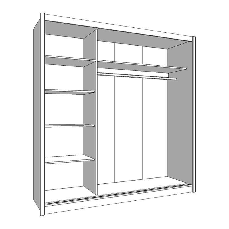 Η ντουλάπα NAVARA 215 διαθέτει δύο συρόμενες πόρτες, εξοικονομώντας χώρο και διευκολύνοντας την πρόσβαση στα ρούχα σας. Στην εσωτερική διάταξή της, θα βρείτε τέσσερα ράφια από τη μία πλευρά, ιδανικά για αποθήκευση ρούχων ή άλλων προσωπικών αντικειμένων, και από την άλλη πλευρά, ένα πατάρι και μεταλλική βέργα για κρέμασμα ρούχων, για να οργανώσετε τα ρούχα σας με τον πιο βολικό τρόπο.