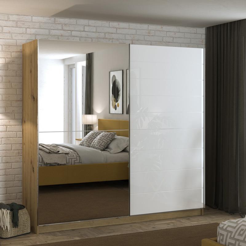 Η συρόμενη ντουλάπα υπνοδωματίου Mondego 220 με Καθρέπτη είναι η ιδανική επιλογή για εκείνους που επιθυμούν μια κομψή, λειτουργική και μοντέρνα αποθηκευτική λύση για το υπνοδωμάτιο τους. Με τον εκλεπτυσμένο συνδυασμό του λευκού χρώματος στις πόρτες και της artisan oak απόχρωση μελαμίνης, αυτή η ντουλάπα προσφέρει μια γήινη και φυσική εμφάνιση που αναδεικνύει κάθε δωμάτιο.