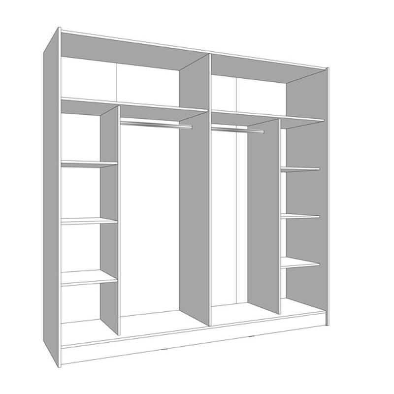 Η δίφυλλη συρόμενη ντουλάπα Mondego 220 δεν προσφέρει μόνο οπτική και αισθητική αλλά και πρακτικότητα καθώς διαθέτει 2 πανομοιότυπους χώρους αποθήκευσης, όπου στο κεντρικό τμήμα διαθέτει 2 χώρους με μεταλλικες ράγες κρέμασης για τα ρούχα και τα πανωφόρια σας, ενώ αριστερά και δεξιά της ντουλάπας υπάρχουν απο 3 ράφια στην κάθε μεριά τα οποία δημιουργούν συνολικά 8 αποθηκευτικούς χώρους για να αποθηκεύετε όλα τα κλινοσκεπάσματα, ρούχα και τα υπόλοιπα προσωπικά σας αντικείμενα. Επίσης, διαθέτει επιπλέον χώρο, στο επάνω μέρος ως πατάρι.