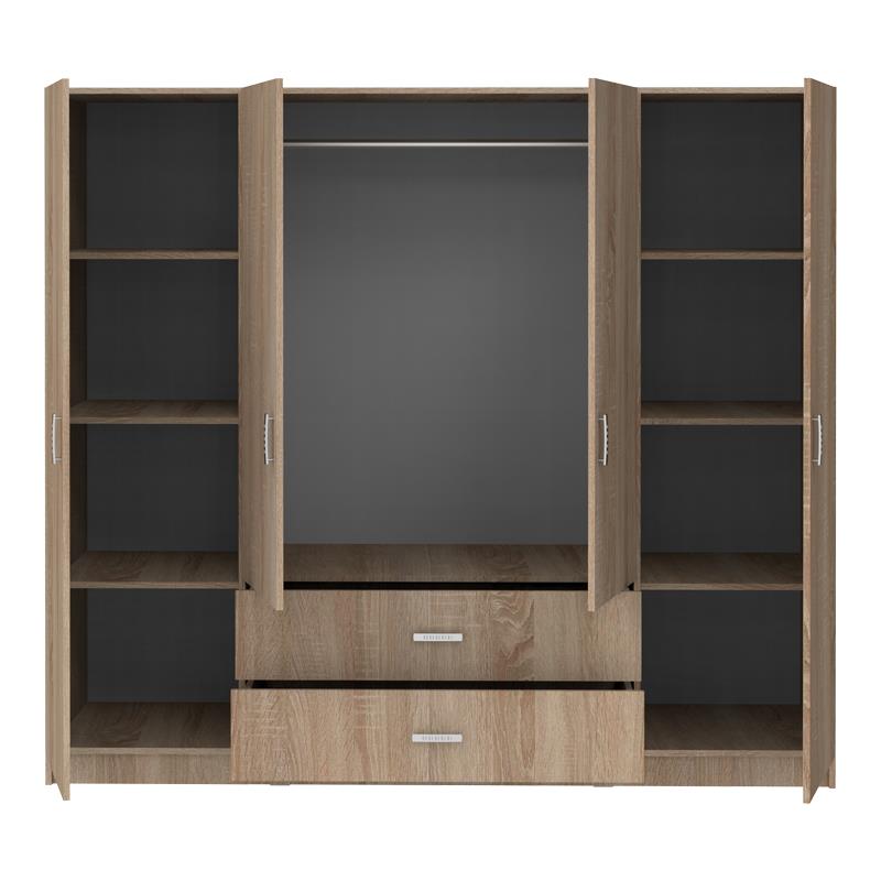 - Στο εσωτερικό περιλαμβάνει μεταλλική βέργα για κρεμάστρες και πολλαπλά ράφια.