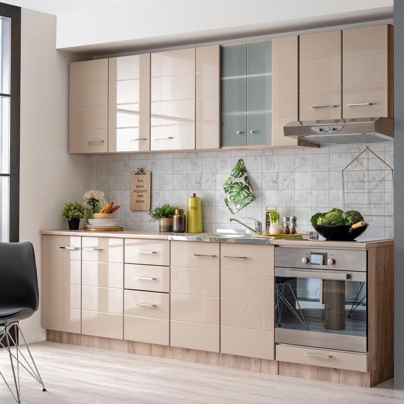 Το κρεμαστό ντουλάπι κουζίνας Diana G60A σε Γκρί Δρύς και άμμου γυαλιστερές πόρτες, προορίζεται για επέκταση και πιθανή τοποθέτηση απορροφητήρα και αποτελεί πρόσθετο τμήμα της σύνθεσης κουζίνας Diana 200.