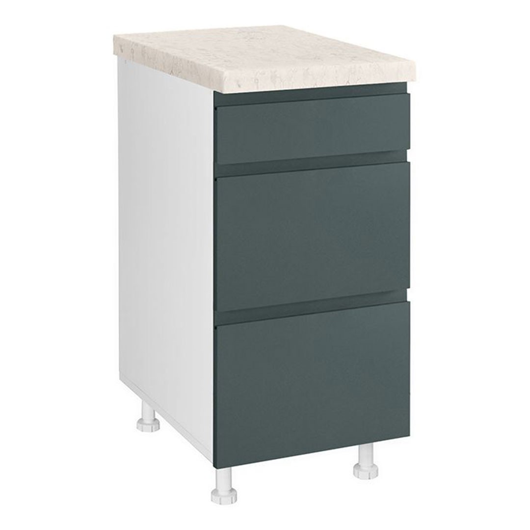 Η επιδαπέδια συρταριέρα κουζίνας - ντουλάπι κουζίνας AURA D40 3F B διαθέτει 3 συρτάρια με τηλεσκοπικό μηχανισμό για εύκολη πρόσβαση σε όλο το χώρο του συρταριού και με λειτουργία slow motion για απαλό και αθόρυβο κλείσιμο, για να τοποθετείτε όσο βάρος θελήσετε χωρίς κανένα άγχος και με εγγύηση 25 ετών για να είστε σίγουροι για την ποιότητα των υλικών. Μπορείτε να το επιλέξετε μέσα από μία μεγάλη παλέτα χρωμάτων ώστε να βρείτε την ιδανική για το χώρο σας και είναι κατασκευασμένο από ενισχυμένη μελαμίνη. Δεν διαθέτει εξωτερικό χερούλι, αλλά σύστημα J-pull χούφτας, σκαμμένο στο ίδιο υλικό MDF της πόρτας. Η επιφάνειά του είναι λεία, απαλή στην αφή και ανθεκτική στα δακτυλικά αποτυπώματα, ενώ το υλικό κατασκευής είναι ανθεκτικό σε γρατζουνιές και χημικά. Τα ποδαράκια είναι ρυθμιζόμενα ανάλογα με τις οποιεσδήποτε ανωμαλίες του εδάφους.