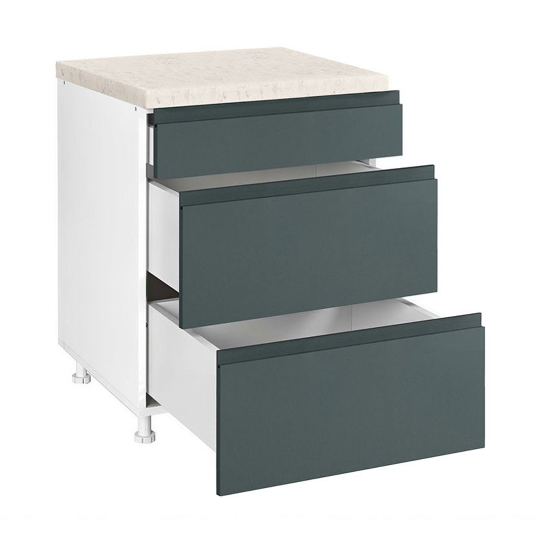 Η επιδαπέδια συρταριέρα κουζίνας - ντουλάπι κουζίνας AURA D60 3F B διαθέτει 3 συρτάρια με τηλεσκοπικό μηχανισμό για εύκολη πρόσβαση σε όλο το χώρο του συρταριού και με λειτουργία slow motion για απαλό και αθόρυβο κλείσιμο, για να τοποθετείτε όσο βάρος θελήσετε χωρίς κανένα άγχος και με εγγύηση 25 ετών για να είστε σίγουροι για την ποιότητα των υλικών. Μπορείτε να την επιλέξετε μέσα από μία μεγάλη παλέτα χρωμάτων ώστε να βρείτε την ιδανική για το χώρο σας και είναι κατασκευασμένο από ενισχυμένη μελαμίνη. Δεν διαθέτει εξωτερικό χερούλι, αλλά σύστημα J-pull χούφτας, σκαμμένο στο ίδιο υλικό MDF της πόρτας. Η επιφάνειά του είναι λεία, απαλή στην αφή και ανθεκτική στα δακτυλικά αποτυπώματα, ενώ το υλικό κατασκευής είναι ανθεκτικό σε γρατζουνιές και χημικά. Τα ποδαράκια είναι ρυθμιζόμενα ανάλογα με τις οποιεσδήποτε ανωμαλίες του εδάφους.