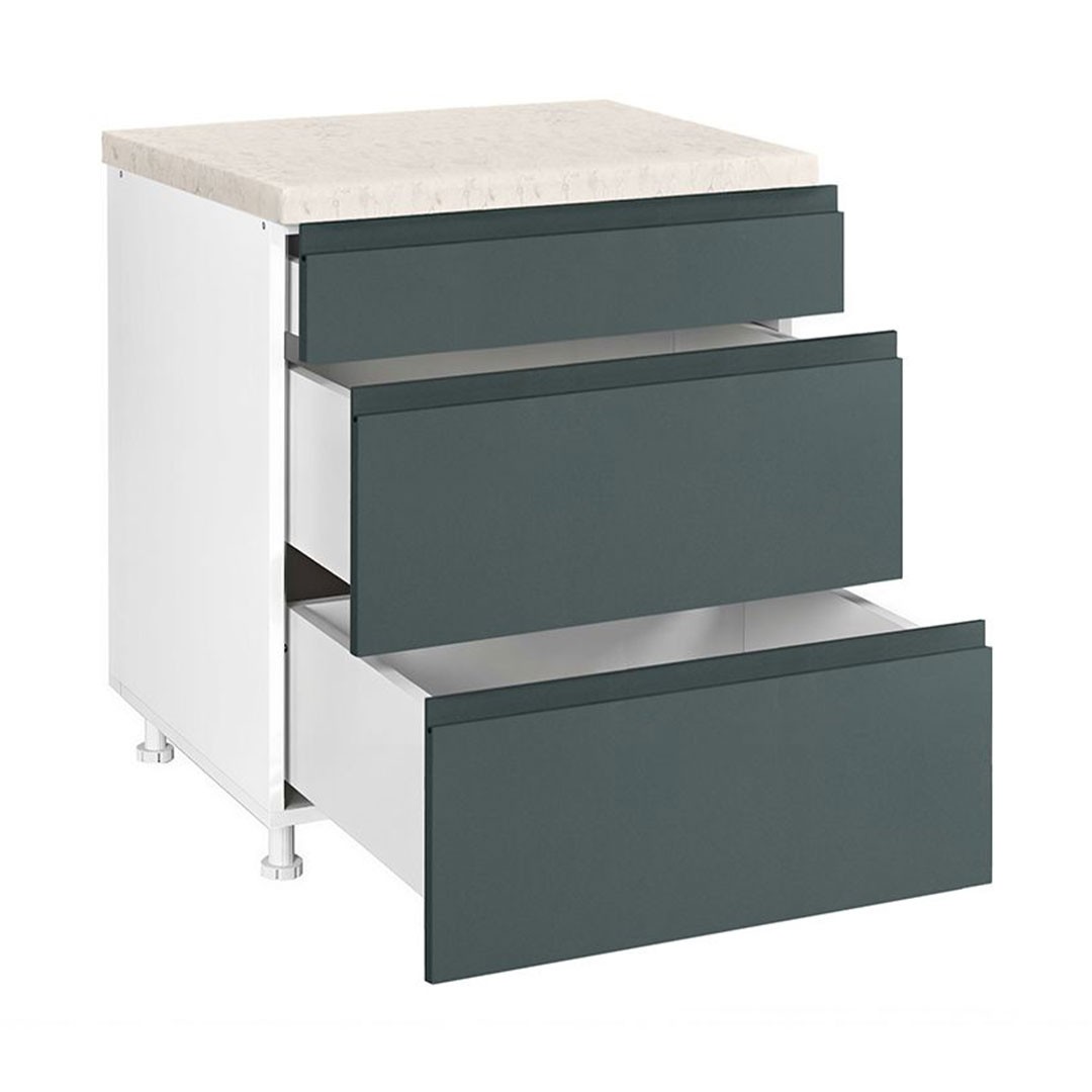 Η επιδαπέδια συρταριέρα κουζίνας - ντουλάπι κουζίνας AURA D80 3F B διαθέτει 3 συρτάρια με τηλεσκοπικό μηχανισμό για εύκολη πρόσβαση σε όλο το χώρο του συρταριού και με λειτουργία slow motion για απαλό και αθόρυβο κλείσιμο, για να τοποθετείτε όσο βάρος θελήσετε χωρίς κανένα άγχος και με εγγύηση 25 ετών για να είστε σίγουροι για την ποιότητα των υλικών. Μπορείτε να την επιλέξετε μέσα από μία μεγάλη παλέτα χρωμάτων ώστε να βρείτε την ιδανική για το χώρο σας και είναι κατασκευασμένο από ενισχυμένη μελαμίνη. Δεν διαθέτει εξωτερικό χερούλι, αλλά σύστημα J-pull χούφτας, σκαμμένο στο ίδιο υλικό MDF της πόρτας. Η επιφάνειά του είναι λεία, απαλή στην αφή και ανθεκτική στα δακτυλικά αποτυπώματα, ενώ το υλικό κατασκευής είναι ανθεκτικό σε γρατζουνιές και χημικά. Τα ποδαράκια είναι ρυθμιζόμενα ανάλογα με τις οποιεσδήποτε ανωμαλίες του εδάφους.