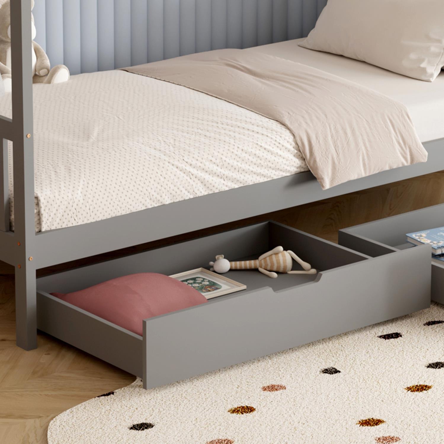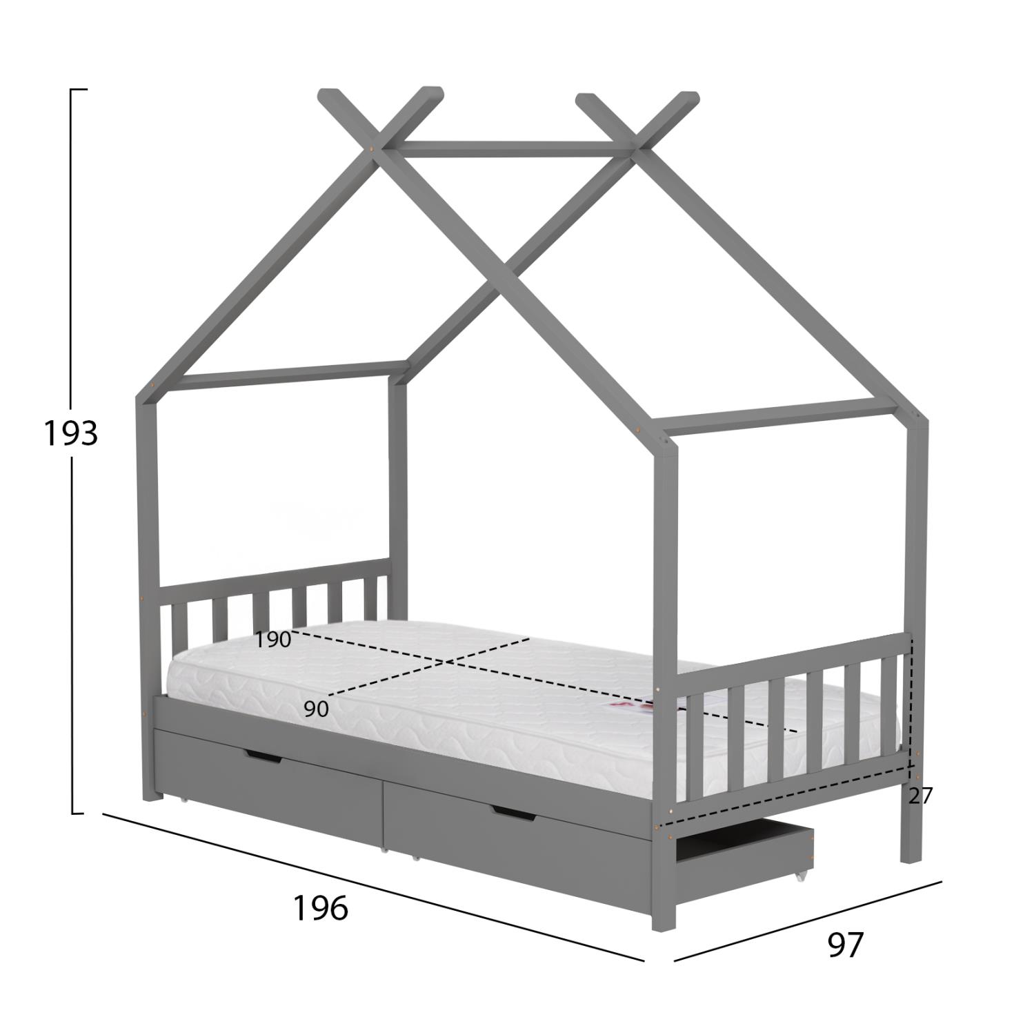 Το παιδικό κρεβάτι KLARICE τύπου Montessori σε διάσταση για στρώμα 90x190εκ, είναι κατασκευασμένο από ξύλο πεύκου σε ΓΚΡΙ χρώμα. Όλο το κρεβάτι έχει σχήμα σπιτιού και διαθέτει 2 συρτάρια στο κάτω μέρος ως αποθηκευτικό χώρο αλλά και προστατευτικό κάγκελα σε 2 πλευρές, ενώ το στρώμα τοποθετείται σε τάβλες από κόντρα-πλακέ ξυλεία.