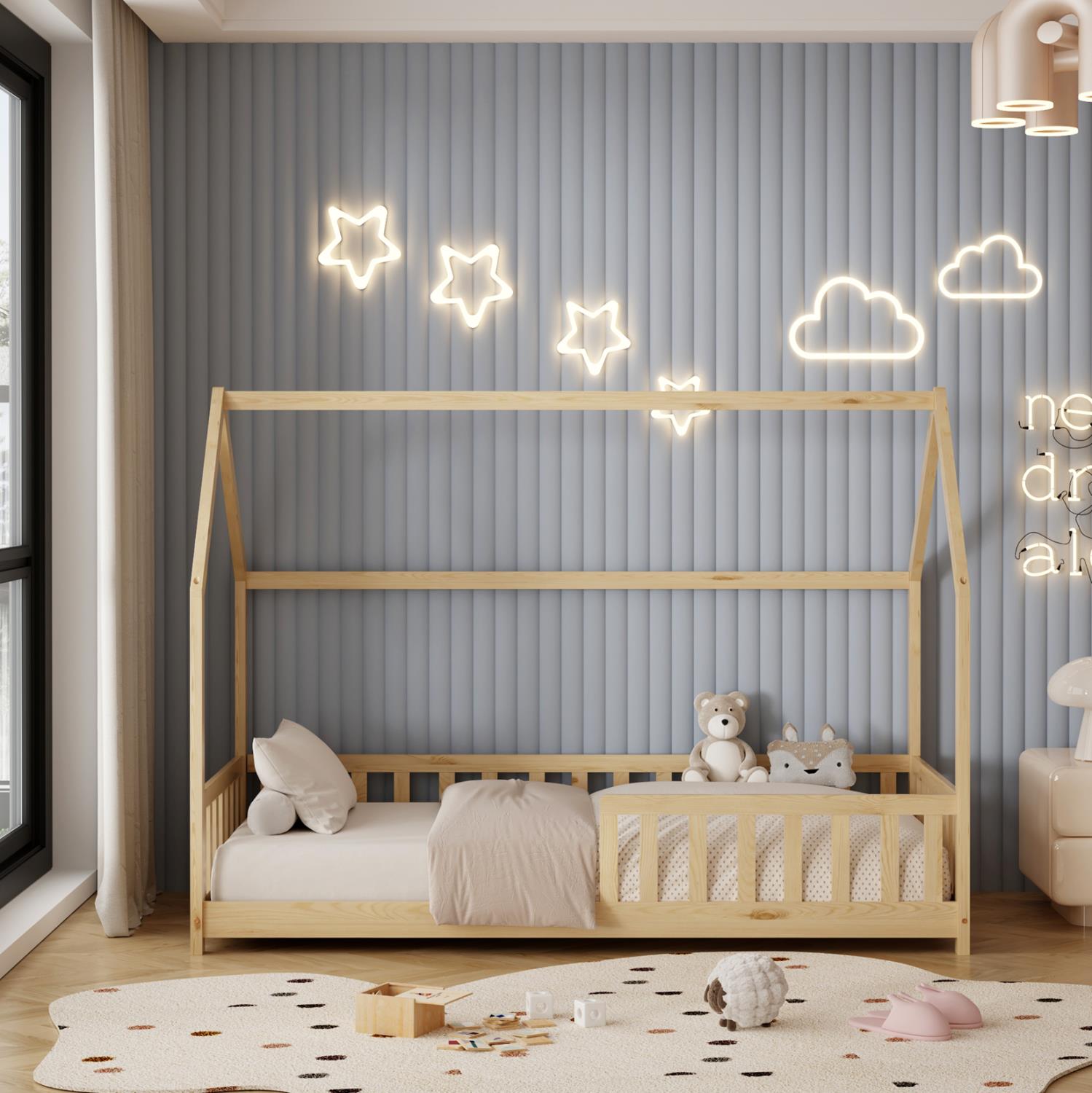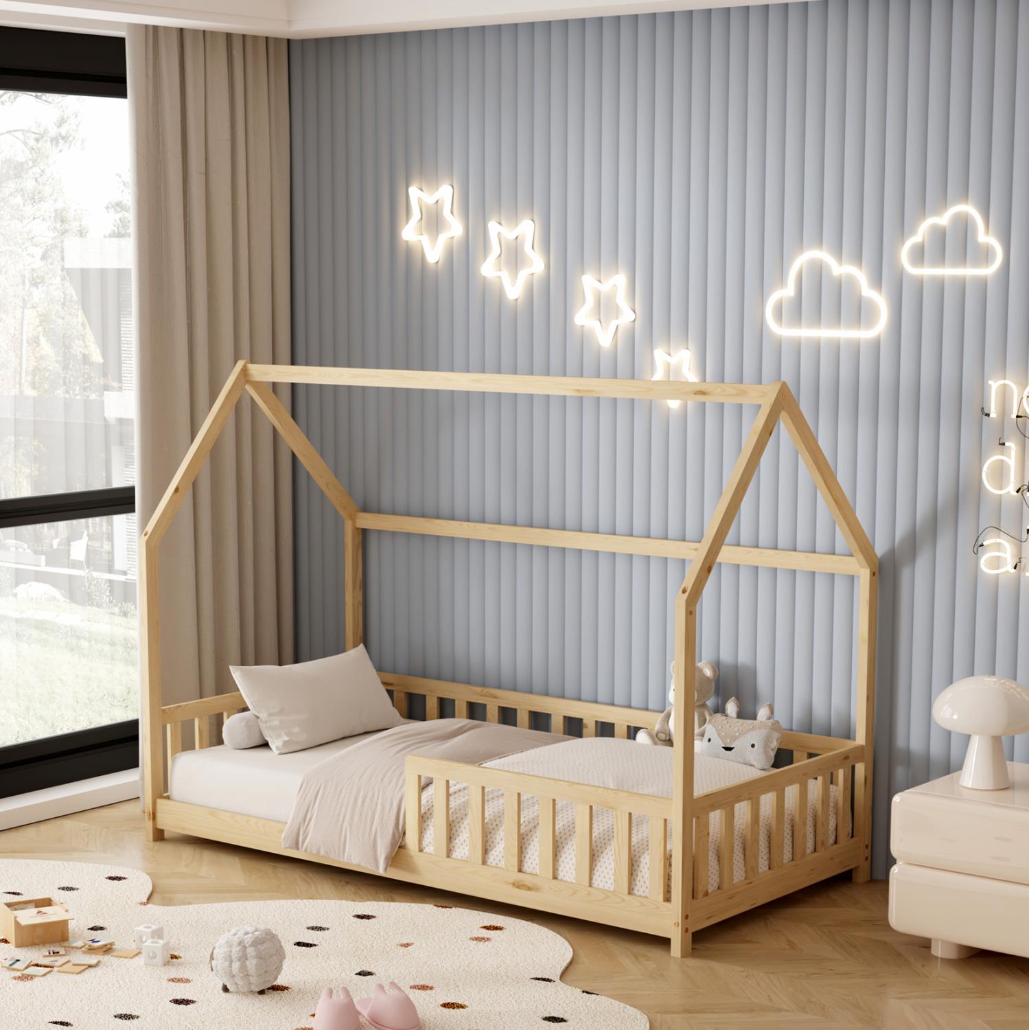 Το παιδικό κρεβάτι PHYLLIS τύπου Montessori σε διάσταση για στρώμα 90x190εκ, είναι κατασκευασμένο από ξύλο πεύκου σε ΦΥΣΙΚΟ χρώμα. Όλο το κρεβάτι έχει σχήμα σπιτιού με εξαιρετικά χαμηλά πόδια και περιμετρικά κάγκελα, ενώ το στρώμα τοποθετείται σε τάβλες από κόντρα-πλακέ ξυλεία.