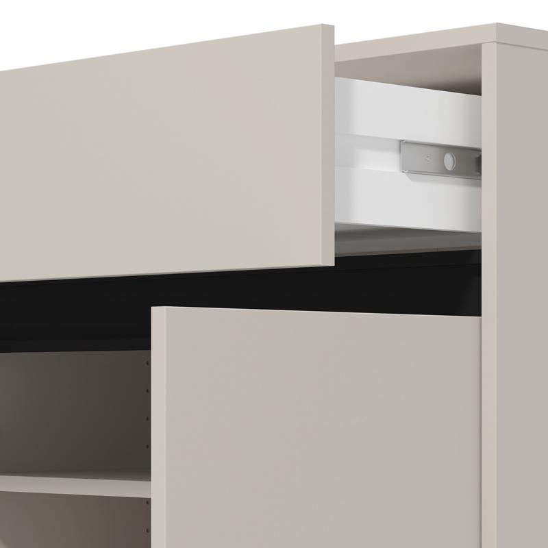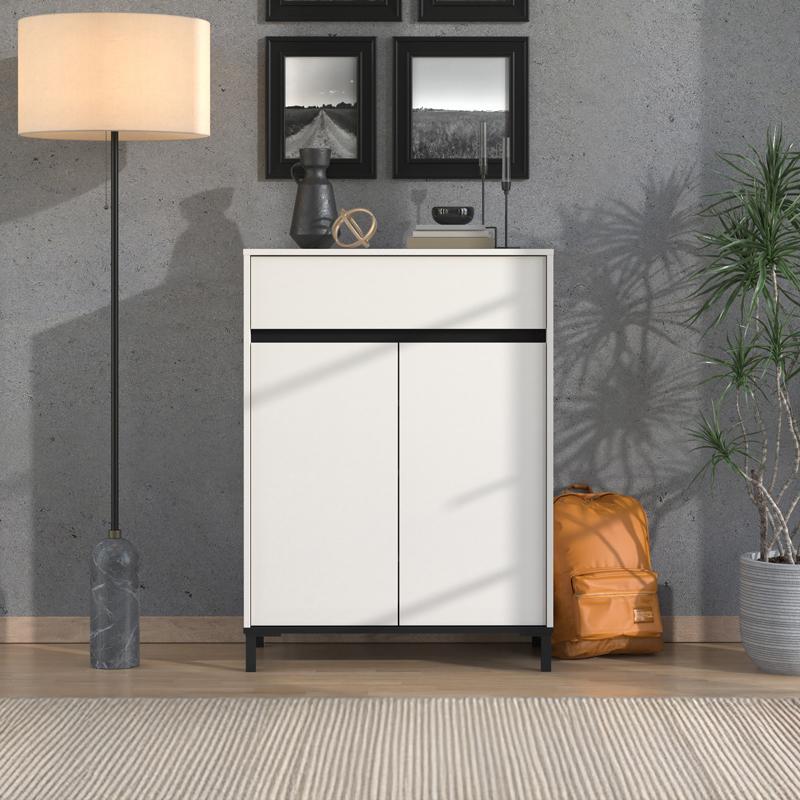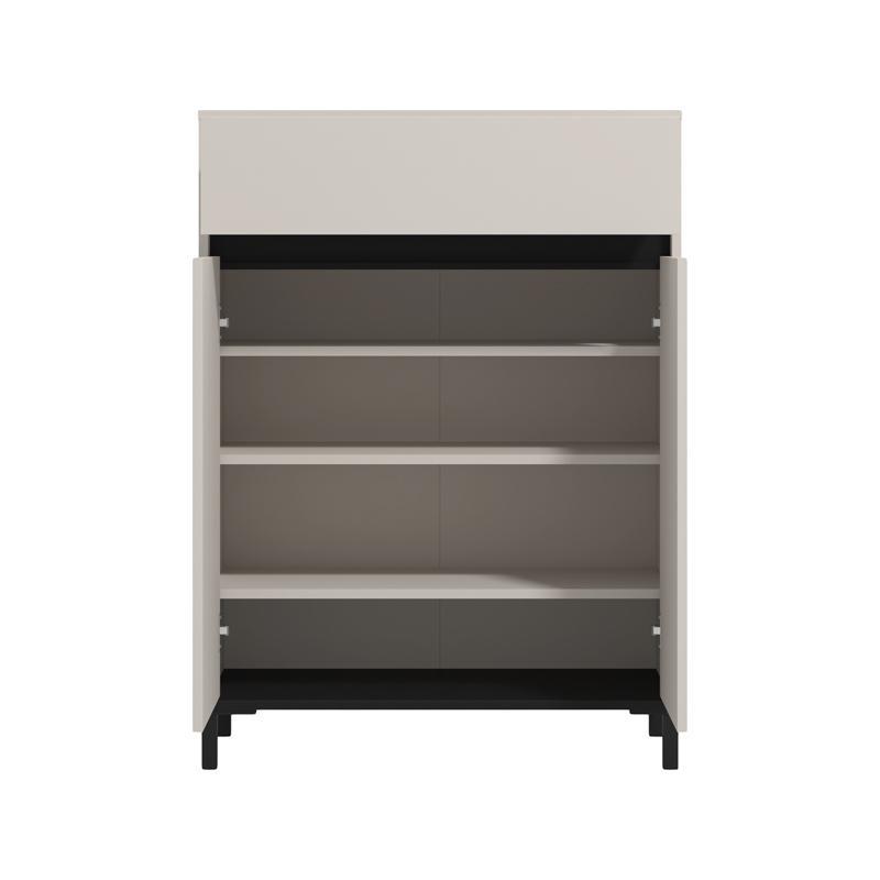 Διαθέτει ένα λειτουργικό συρτάρι στο επάνω μέρος, ιδανικό για μικροαντικείμενα όπως κλειδιά, πορτοφόλια ή αξεσουάρ καθημερινής χρήσης, ενώ απο κάτω του, υπάρχει ένα ντουλάπι με 2 πόρτες όπου στο εσωτερικού διαθέτει τρία ράφια, δημιουργόντας έτσι 4 αποθηκευτικούς χώρους, προσφέροντας άφθονο χώρο για την αποθήκευση παπουτσιών, κρατώντας τον χώρο σας καθαρό και οργανωμένο. Ιδιαίτερο στοιχείο αποτελεί και η απουσία χερουλιών, καθώς διαθέτει κρυφό σύστημα χερουλιών , τύπου Gola, για πιο μοντέρνο αποτέλεσμα.