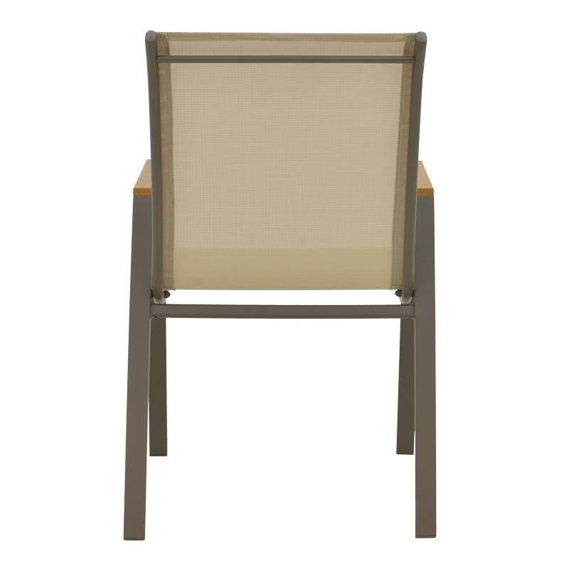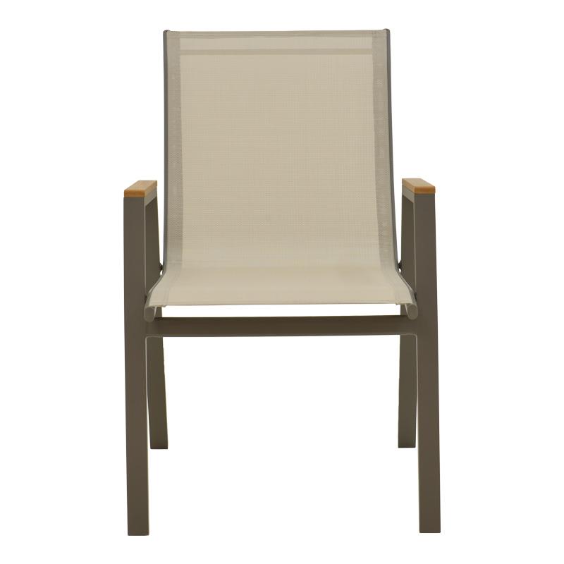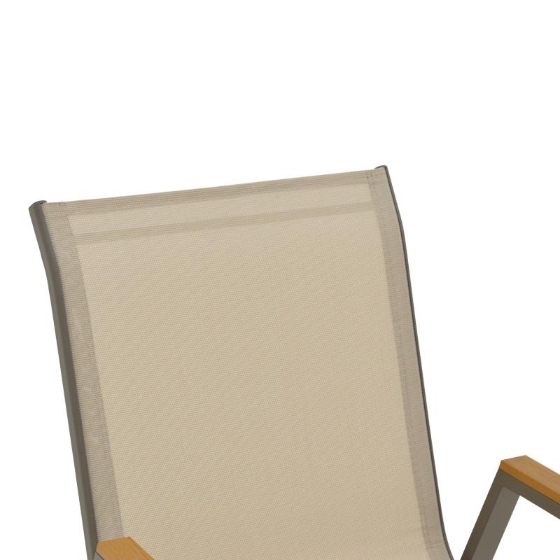 - Textilene: Το textilene είναι ένα εξαιρετικά ανθεκτικό υλικό που χρησιμοποιείται ευρέως σε επίπλωση εξωτερικών χώρων και εξαρτήματα. Αποτελείται από πολυεστερικές ινώδεις που επικαλύπτονται με PVC (πολυβινυλοχλωρίδιο), δημιουργώντας ένα υλικό που συνδυάζει ανθεκτικότητα, αντοχή στις καιρικές συνθήκες και εύκαμπτη υφή. Το υλικό αυτό επιτρέπει τη διέλευση του αέρα, βοηθώντας στη διατήρηση μιας δροσερής αίσθησης κατά τη χρήση.