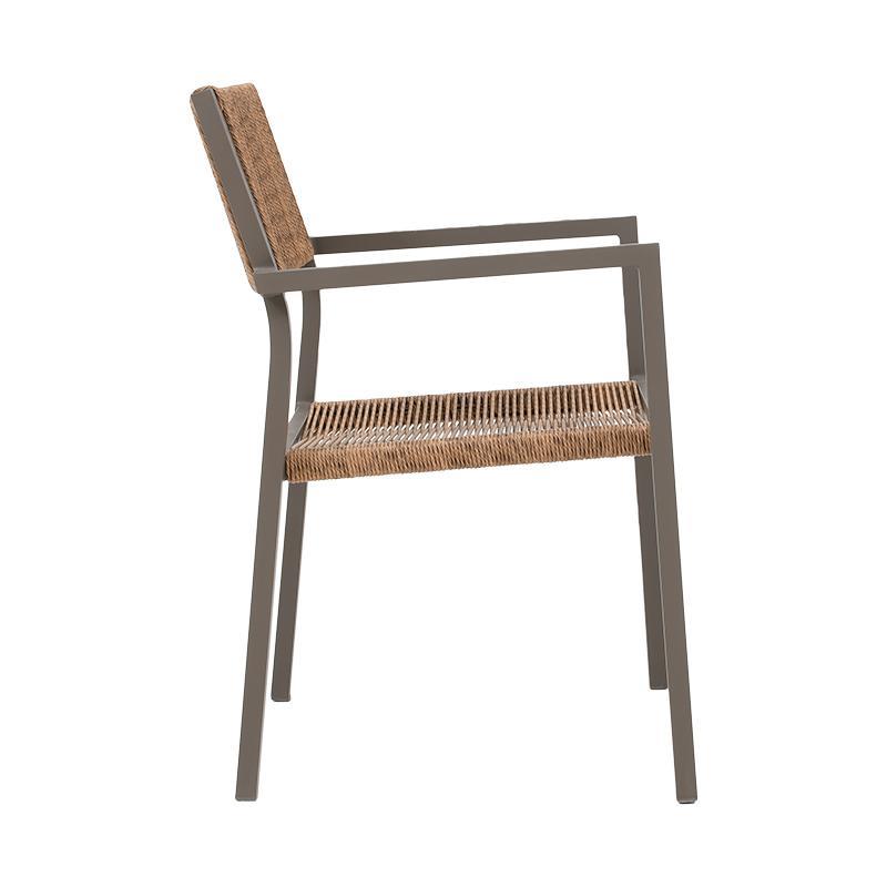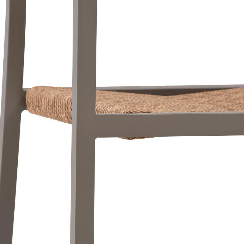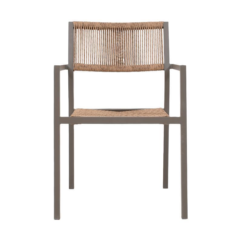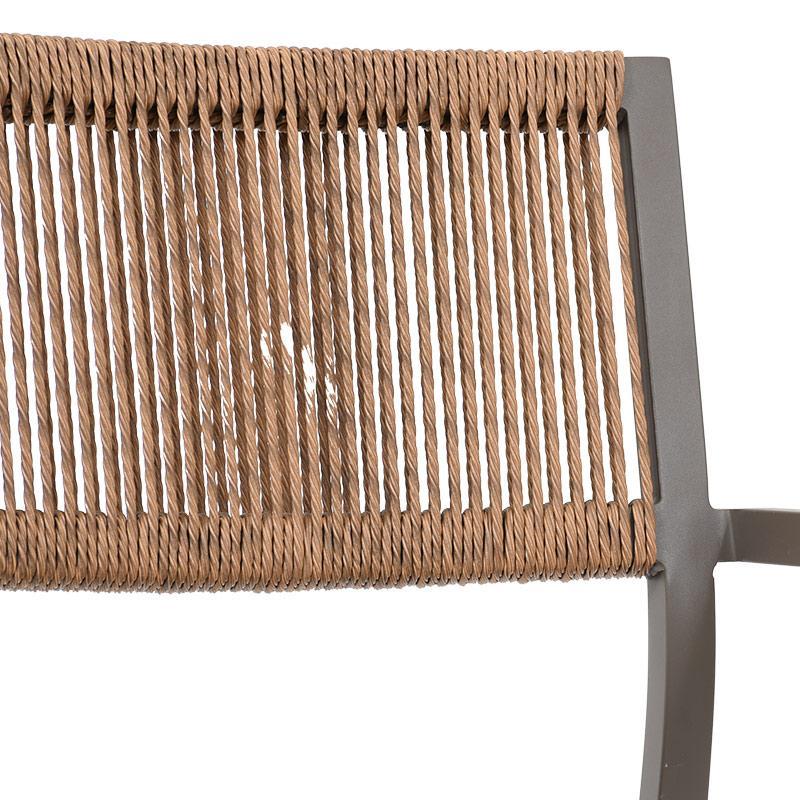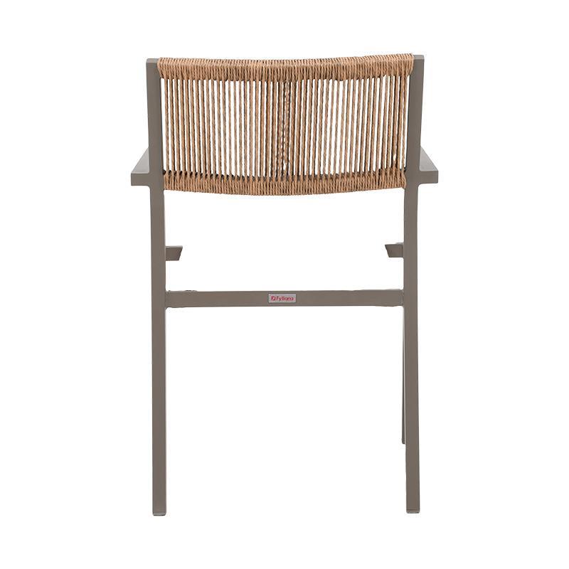 Πλάτη με PE Rattan Twist: Η ελαφρώς κυρτή πλάτη της καρέκλας είναι επενδεδυμένη με ειδικής επεξεργασίας PE Rattan Twist, ένα συνθετικό υλικό που προσφέρει την αίσθηση του φυσικού rattan, αλλά με μεγαλύτερη αντοχή στις εξωτερικές συνθήκες. Το PE Rattan είναι ανθεκτικό στην υγρασία, την ηλιακή ακτινοβολία και τη θερμότητα, διατηρώντας την εμφάνισή του αναλλοίωτη για πολλά χρόνια.