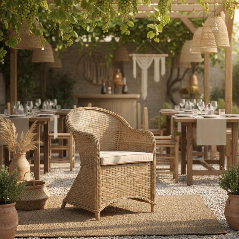 * Κατασκευή από rattan και textilene. Το ρατάν (rattan) είναι ένας φυσικός υλικός που προέρχεται από τον κορμό ορισμένων ειδών φυτών, κυρίως από την οικογένεια των palm. Χρησιμοποιείται ευρέως στην κατασκευή επίπλων και διακοσμητικών αντικειμένων λόγω της φυσικής του ομορφιάς και ανθεκτικότητας. Το ρατάν είναι ελαφρύ, ευέλικτο και ανθεκτικό στις καιρικές συνθήκες, καθιστώντας το ιδανικό για χρήση σε εξωτερικούς χώρους. Επίσης, έχει φυσική θερμομόνωση, καθιστώντας το άνετο στη χρήση ακόμα και σε ζεστά κλίματα. Το Textilene είναι ένα υλικό που συχνά χρησιμοποιείται στην κατασκευή εξωτερικών επίπλων και αξεσουάρ, κυρίως για εξωτερικούς χώρους όπως αίθρια, μπαλκόνια και κήπους. Είναι ένα υλικό που παρέχει αντοχή στις καιρικές συνθήκες και είναι εύκολο στη φροντίδα. Το Textilene κατασκευάζεται από ίνες πολυεστέρα ή πολυπροπυλενίου που είναι υφασμένες μεταξύ τους για να δημιουργήσουν ένα διάτρητο ύφασμα με μικρά άνοιγματα. Αυτή η διάτρητη κατασκευή επιτρέπει στον αέρα να κυκλοφορεί ελεύθερα μέσα από το ύφασμα, ενώ ταυτόχρονα παρέχει αντοχή και αντίσταση στην υγρασία και τον ήλιο.