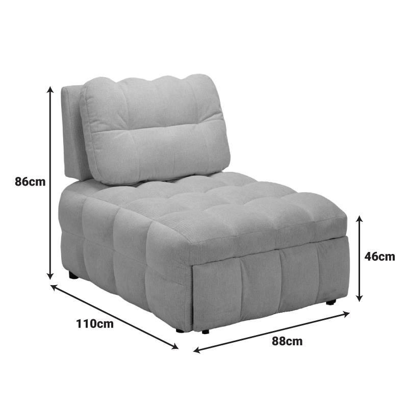 Ανανεώστε τον χώρο σας με τη μοντέρνα πολυθρόνα-κρεβάτι Jelika, σχεδιασμένη για να προσφέρει άνεση και ευελιξία. Η ιδιαίτερη αισθητική της με τα τετραγωνισμένα, καπιτονέ μαξιλάρια προσδίδει έναν αέρα σύγχρονου design, ενώ το συμπαγές της σχήμα την καθιστά ιδανική για κάθε γωνία του σπιτιού.