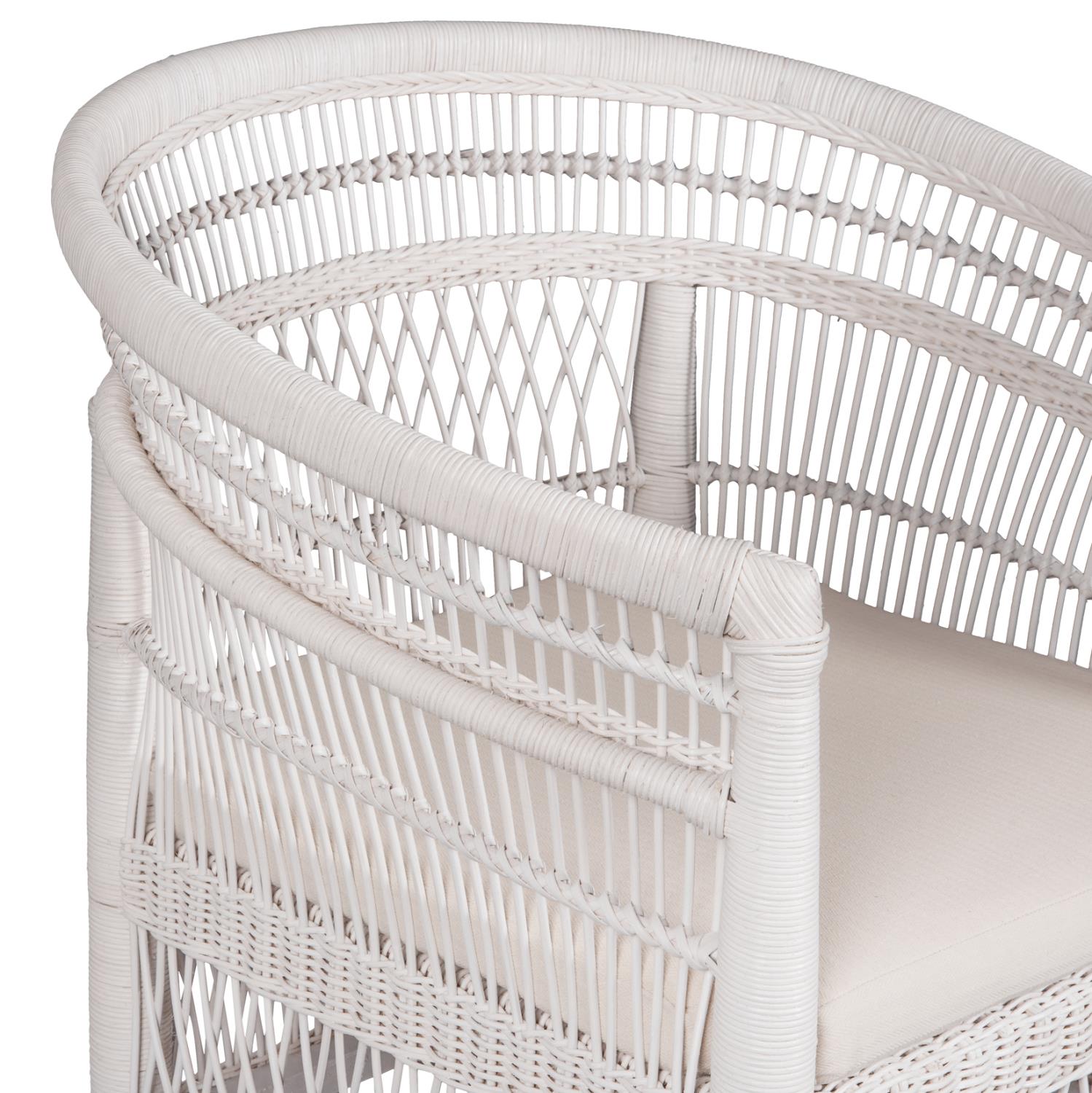 Η πολυθρόνα MALAWI είναι πανέμορφη! Μοντέρνα, άνετη και σταθερή με κυρίαρχο χρώμα το ΛΕΥΚΟ. Το ημικυκλικό κάθισμα της πολυθρόνας είναι άνετο και διαθέτει μαξιλάρι μέτριας σκληρότητας ενώ η πολυθρόνα δίνει την αίσθηση ότι αγκαλιάζει το σώμα. Αυτό όμως που τραβάει τα βλέμματα σε αυτή την πολυθρόνα είναι ότι η πλάτη με τα μπράτσα αποτελούν μια συνεχόμενη κατασκευή με επένδυση από RATTAN που δίνει μια αίσθηση μοναδικότητας στην πολυθρόνα!