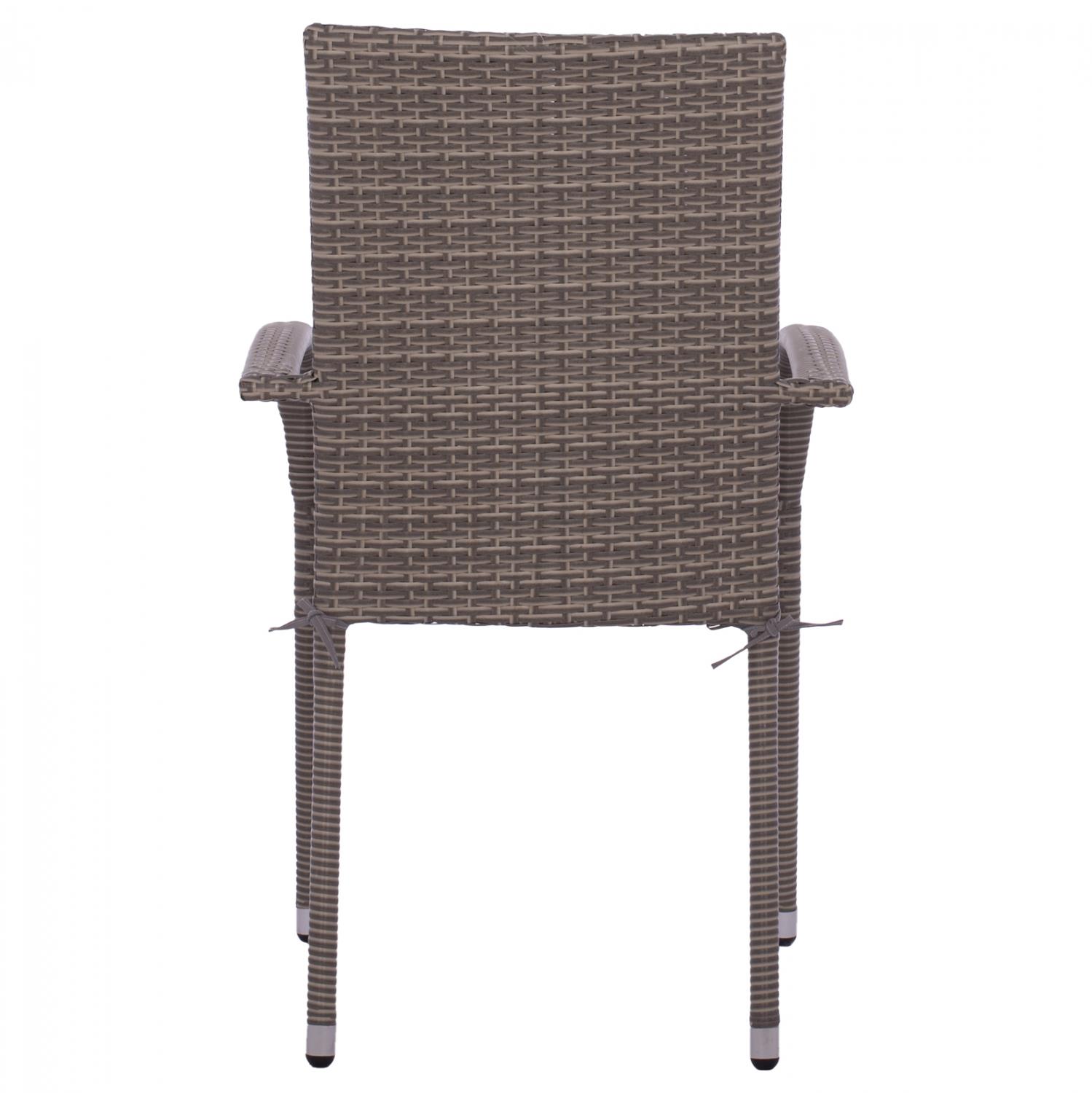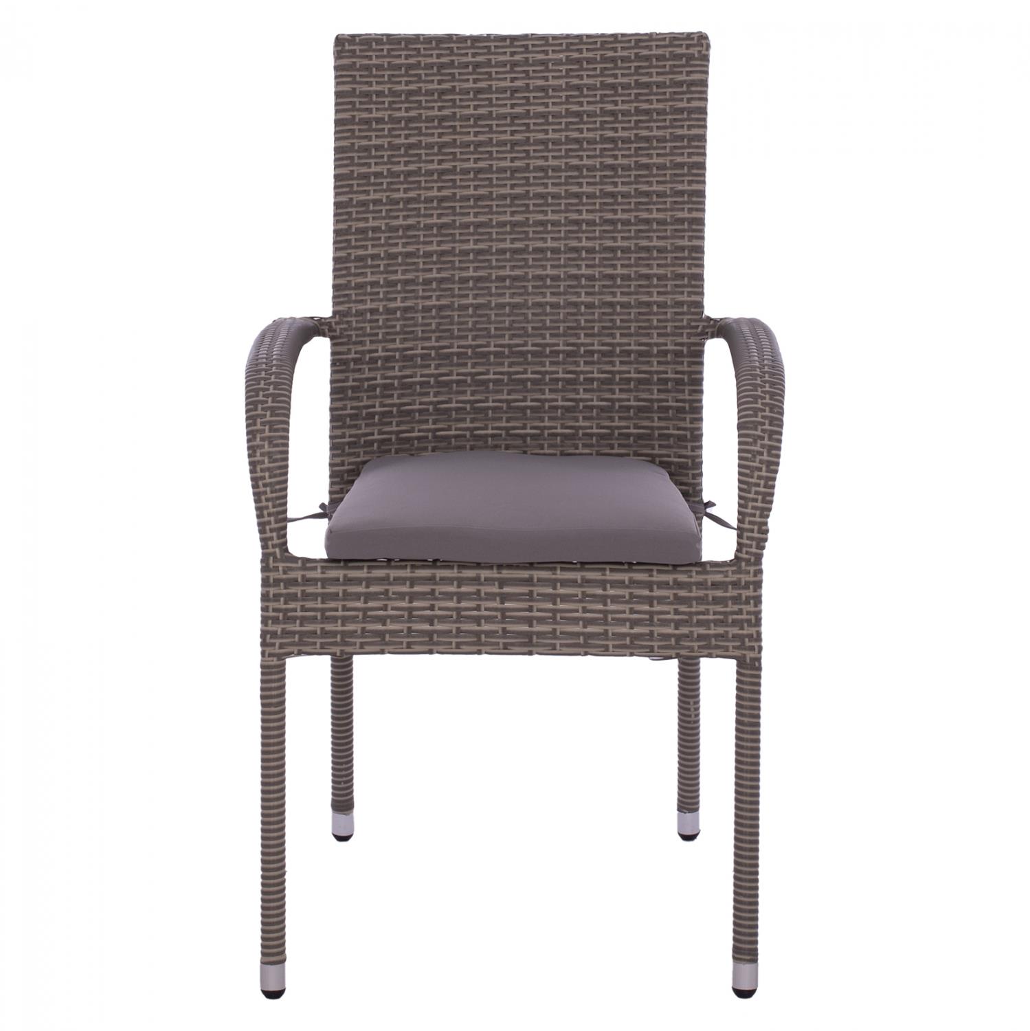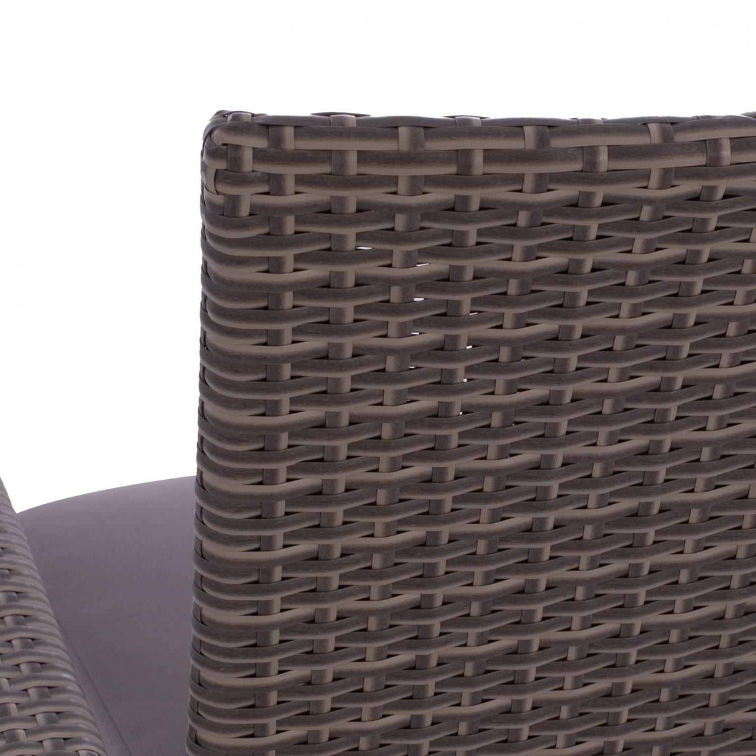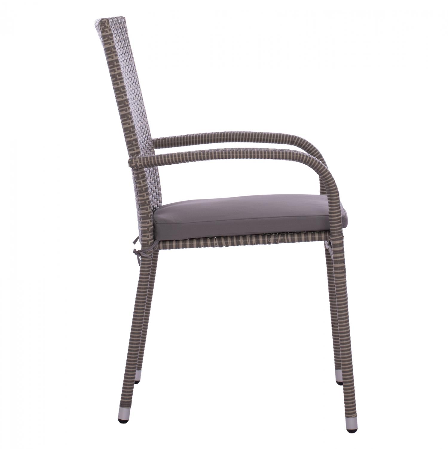 Μοντέρνα πολυθρόνα εξωτερικού χώρου ANISHA , κατασκευασμένη από μεταλλικό σκελετό και επενδυμένη με πλεκτό wicker σε γκρι απόχρωση και γκρι μαξιλάρι.