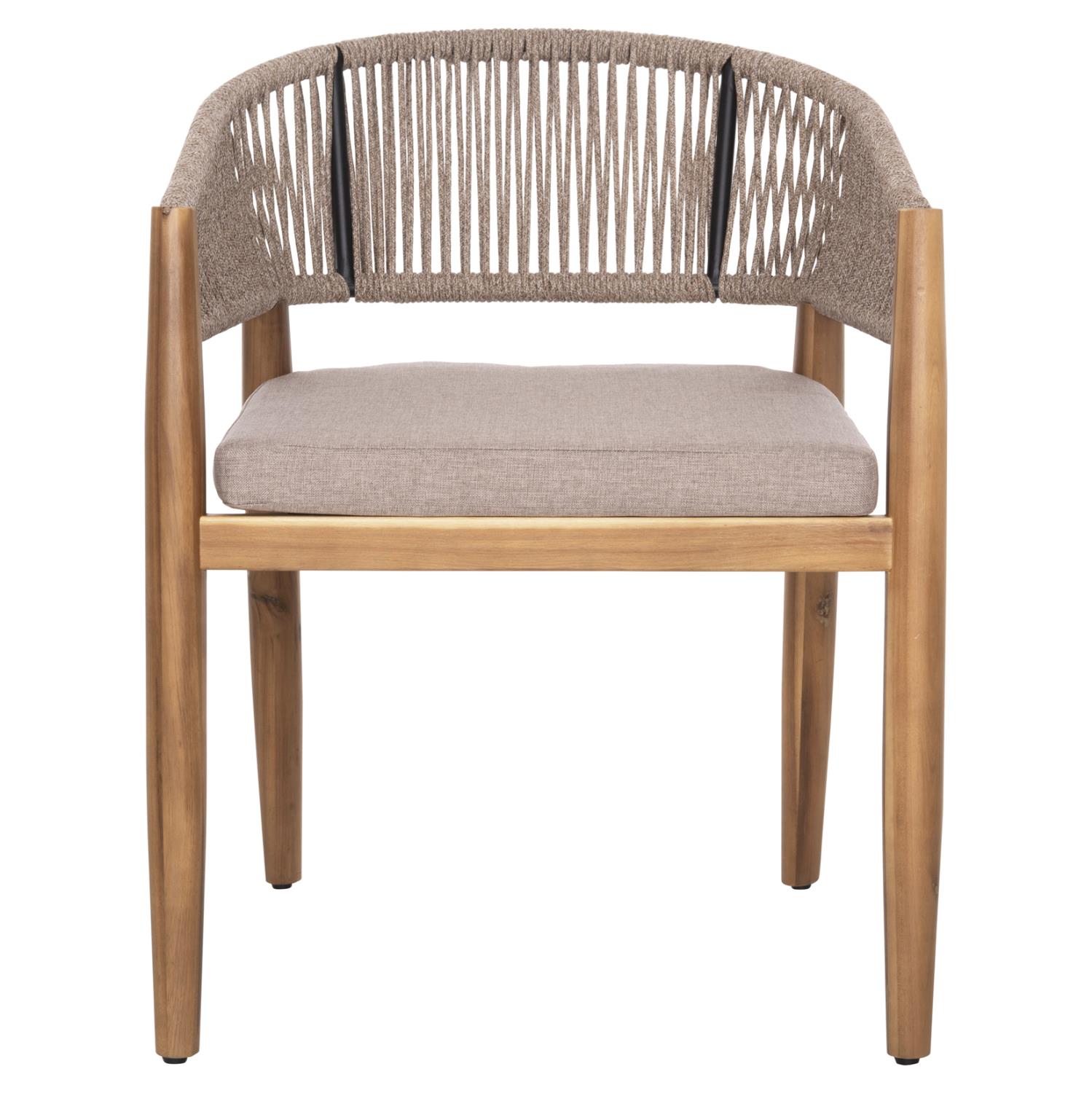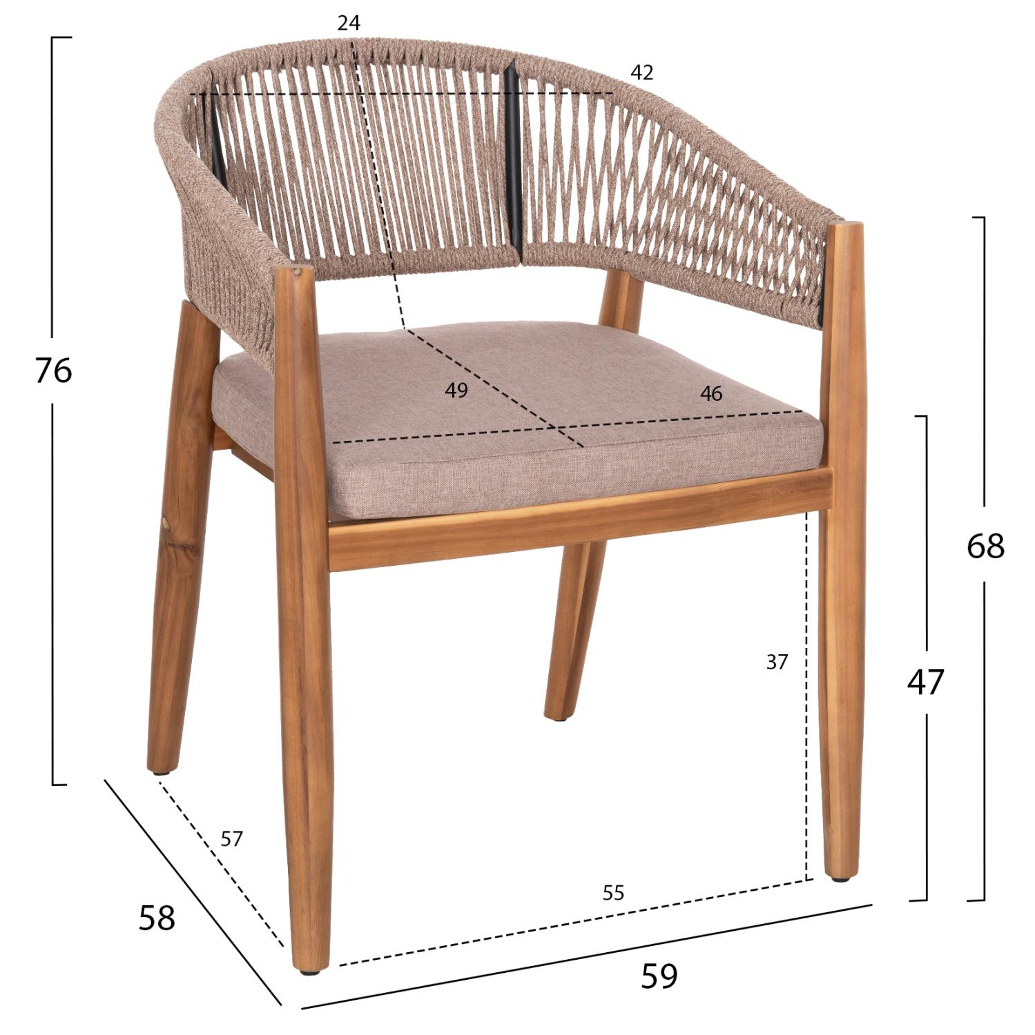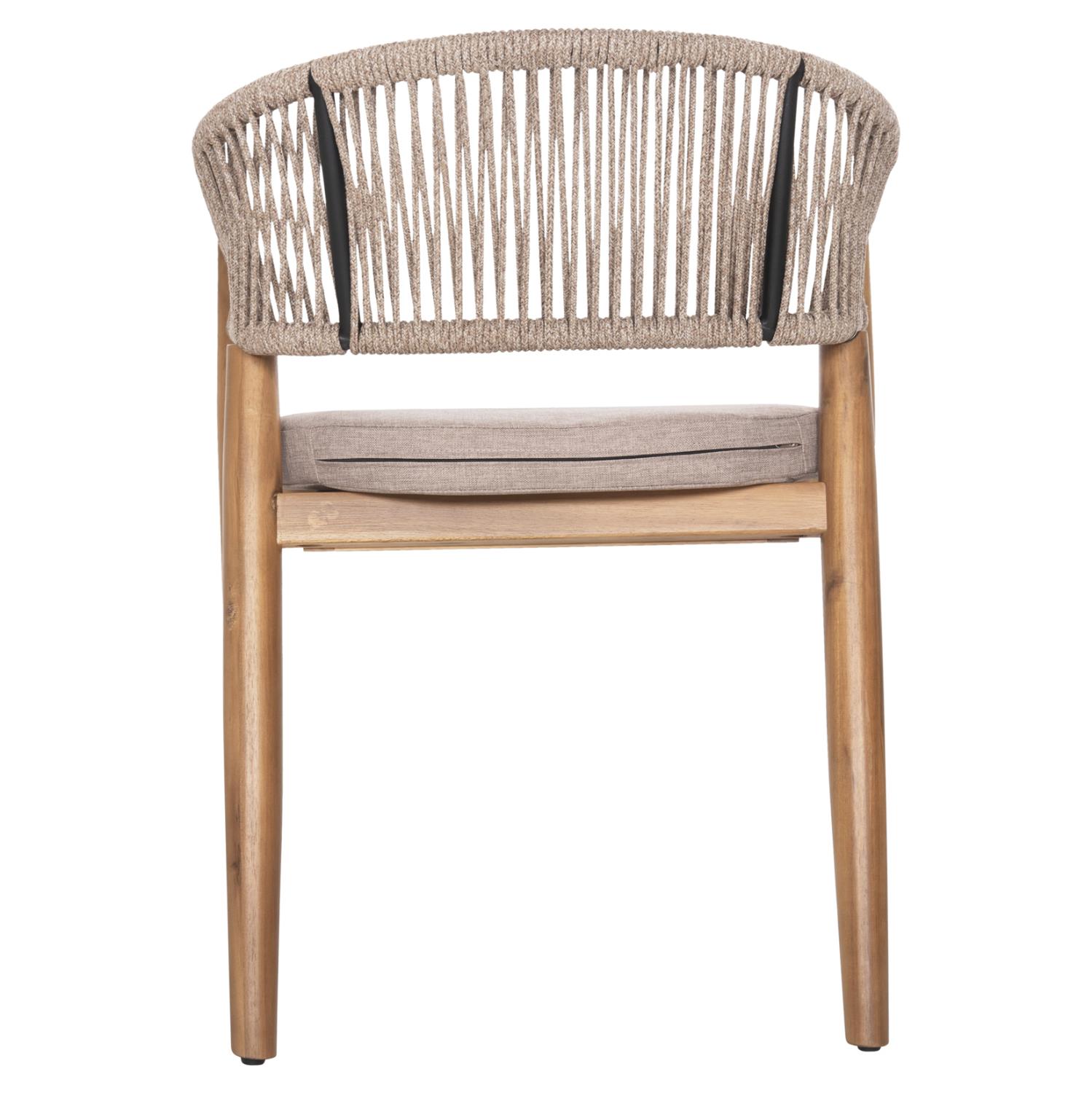 Η πολυθρόνα τραπεζαρίας εξωτερικού χώρου NAVAN συνδυάζει αρμονικά διαφορετικά υλικά κατασκευής. Τα πόδια είναι από ξύλο ακακίας στο ΦΥΣΙΚΟ του χρώμα, ενώ ο σκελετός της πλάτης είναι μεταλλικός με πλέξη από nylon σχοινί σε ΜΠΕΖ χρώμα. Το κάθισμα διαθέτει μαξιλάρι με πολυεστερικό ύφασμα επίσης σε ΜΠΕΖ χρώμα. Οι σχεδιαστικές γραμμές είναι κομψές και με γνώμονα την άνεση του χρήστη και θα αποτελέσει το κέντρο ενδιαφέροντος οπουδήποτε και αν τοποθετηθεί, ιδιαίτερα όμως αν συνδυαστεί με το ανάλογο τραπέζι.