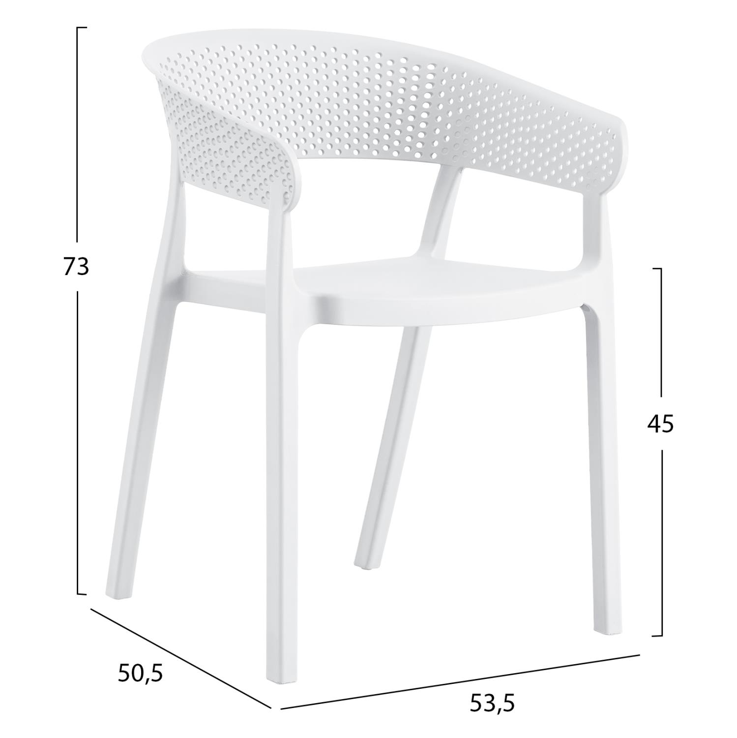Πολυθρόνα πολυπροπυλενίου PERFOE σε ΛΕΥΚΟ χρώμα. Ιδανική πρόταση για χρήση σε εξωτερικούς χώρους, είτε επαγγελματικούς (χώροι δεξιώσεων, εταιρείες catering, κλπ.) είτε για το σπίτι. Η πολυθρόνα αποτελείται από ένα λείο κάθισμα και μια ημικυκλική, ανεξάρτητη και «τρυπητή» πλάτη και μπράτσα. Είναι πανέμορφη και θα αναβαθμίσει αισθητικά κάθε εξωτερικό χώρο.