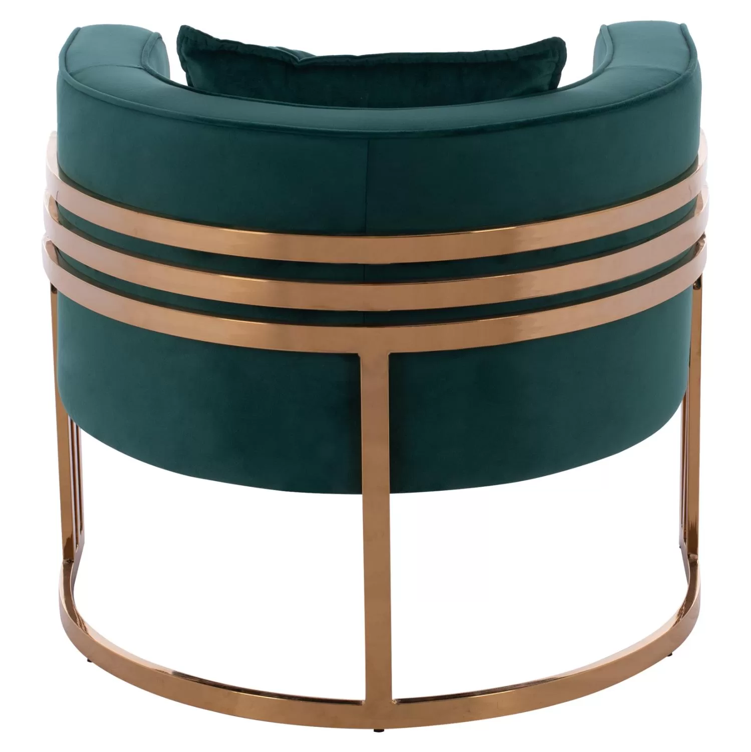 Η πολυθρόνα ΤΙΑΝΑ είναι μια πανέμορφη πολυθρόνα σε κυπαρισσί χρώμα και μεταλλικό σκελετό σε χρυσό χρώμα. Ο σκελετός καταλήγει στα πόδια της πολυθρόνας που είναι σε ημικυκλική διάταξη βάσης με 3 κάθετα σταθερά πάνω στο μεταλλικό ημικύκλιο. Μια καρέκλα που δίνει κάτι το ξεχωριστό σε οποιοδήποτε επαγγελματικό χώρο. Ξεχωριστή, ποιοτική και κομψή σίγουρα θα τραβήξει τα βλέμματα. Η πλάτη είναι χαμηλή αλλά συνοδεύεται από ένα μαλακό μαξιλάρι, ενώ όλη η πολυθρόνα έχει βελούδινη επένδυση με ρέλι στις ραφές, πράγμα που επιτείνει τον ιδιαίτερο χαρακτήρα αυτής της πολυθρόνας.