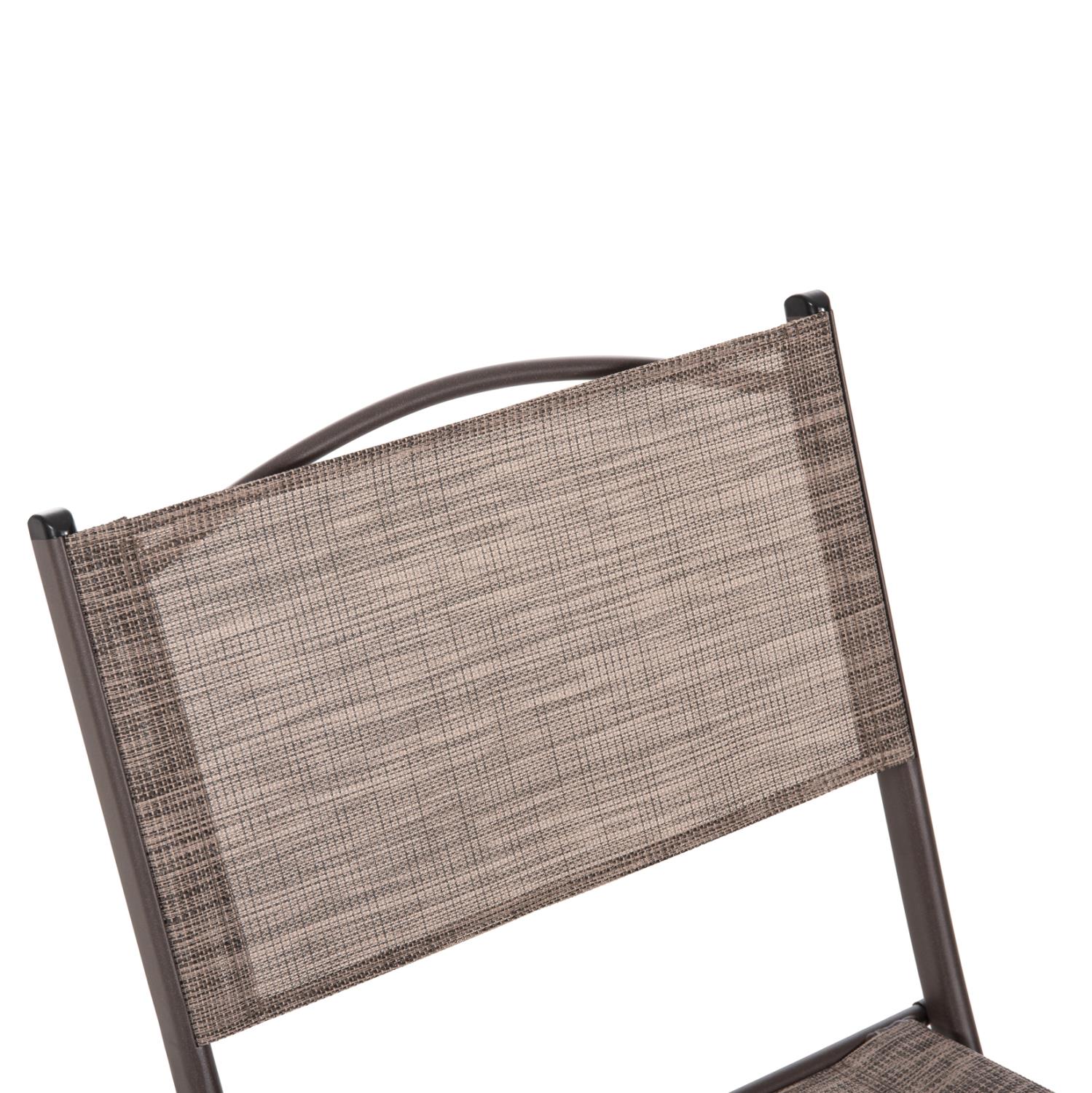 Ο σκελετός της καρέκλας είναι μεταλλικός με ηλεκτροστατική βαφή, ενώ το πανί textilene είναι προδιαγραφών 1Χ1. Το textilene είναι ένα παχύ, ισχυρό και ανθεκτικό πολυεστερικό ύφασμα. Σημαίνει ότι είναι κατασκευασμένο από πολυεστερικά νήματα επικαλυμμένα με PVC.