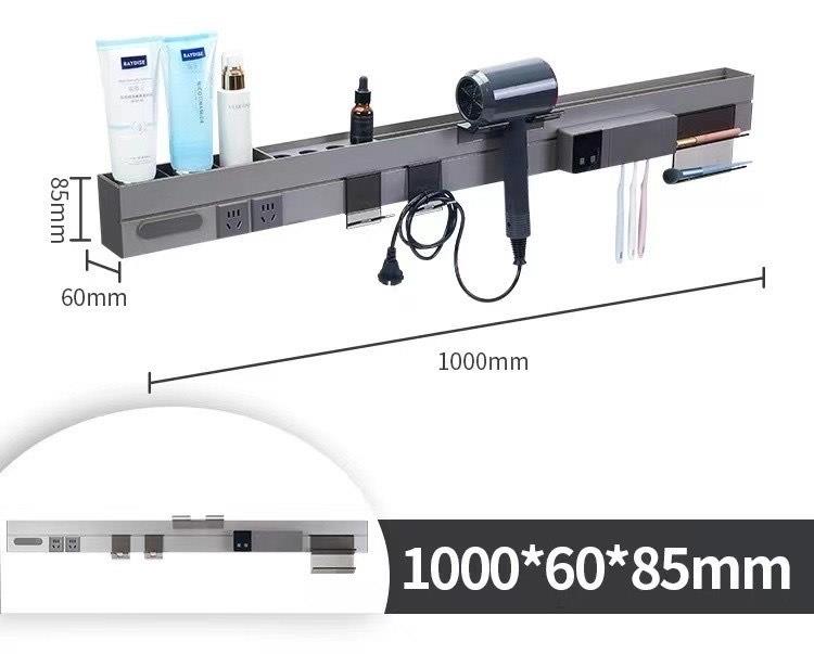 - Διαθέτει εταζέρα με θήκες για πιστολάκι και είδη προσωπικής υγιεινής. Υποδοχή για ρεύμα και συσκευή με σύστημα αποστείρωσης