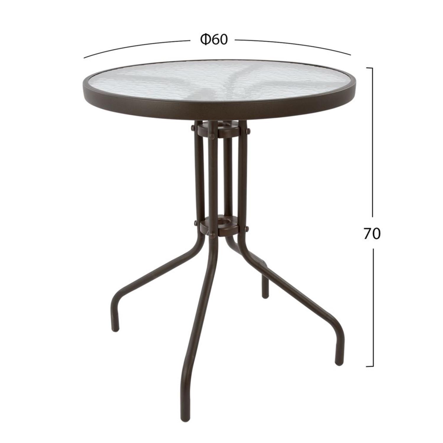 Σετ εξωτερικού χώρου με στρογγυλό τραπέζι με ΚΑΦΕ μεταλλικό σκελετό και γυάλινη θολή ΕΝΙΣΧΥΜΕΝΗ επιφάνεια και 2 μεταλλικές πτυσσόμενες καρέκλες με textilene, σε ΚΑΦΕ χρώμα.