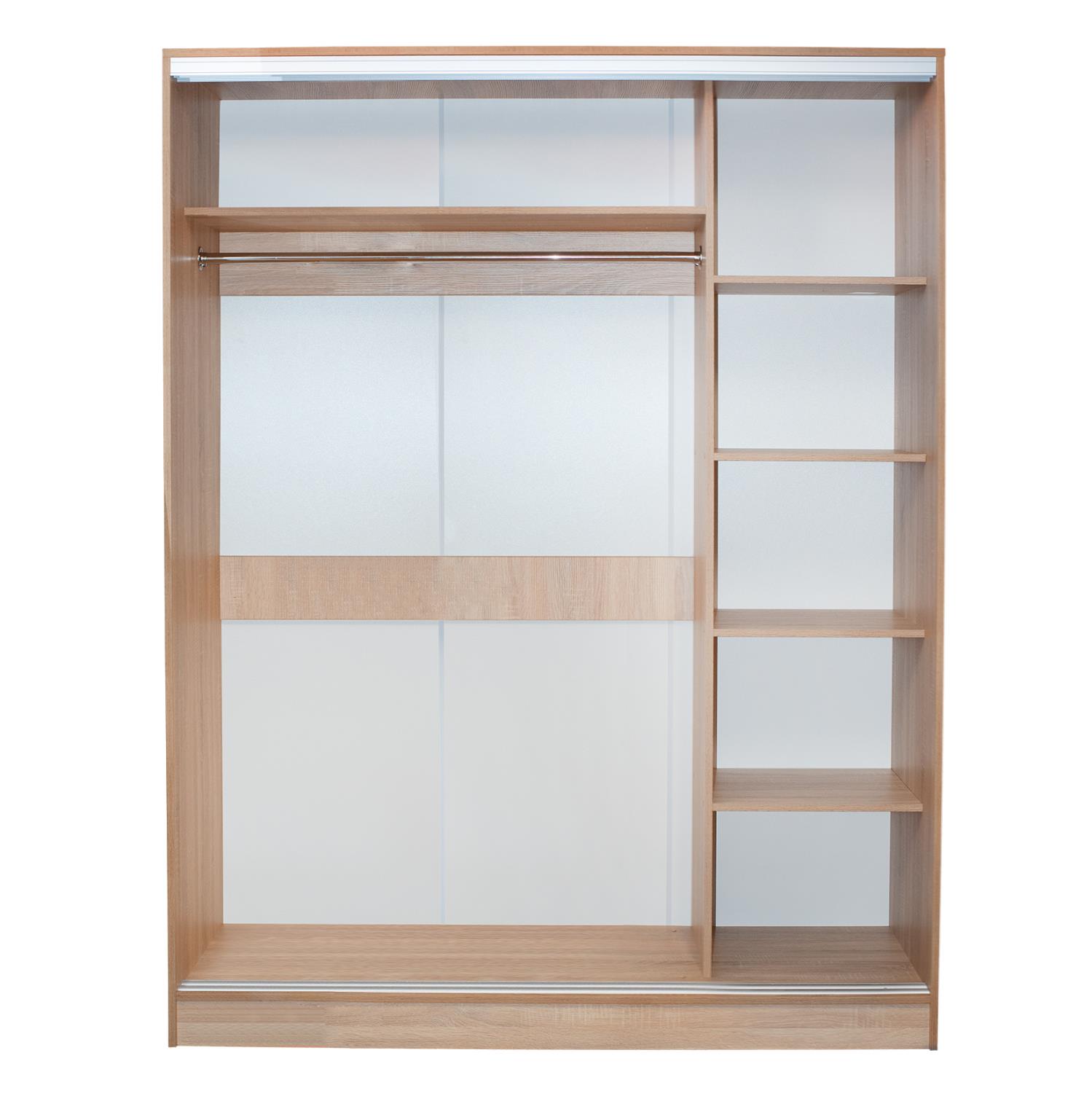 Η σύνθεση κρεβατοκάμαρας ADLER αποτελείται από α) ένα διπλό κρεβάτι, β) δύο κομοδίνα με συρταράκι κι ένα ράφι, γ) μια συρταριέρα/μπουφέ με 3 συρτάρια, 2 ντουλάπια, κι ένα ανοιχτό ράφι, δ) έναν σομιέ για το κρεβάτι με ανθεκτικές ξύλινες ανατομικές τάβλες, και τέλος ε) μια δίφυλλη ντουλάπα με συρόμενες πόρτες και ολόσωμο καθρέπτη στην μία πόρτα. Όλη η σύνθεση είναι της ίδιας σειράς σε χρώμα SONAMA OAK.