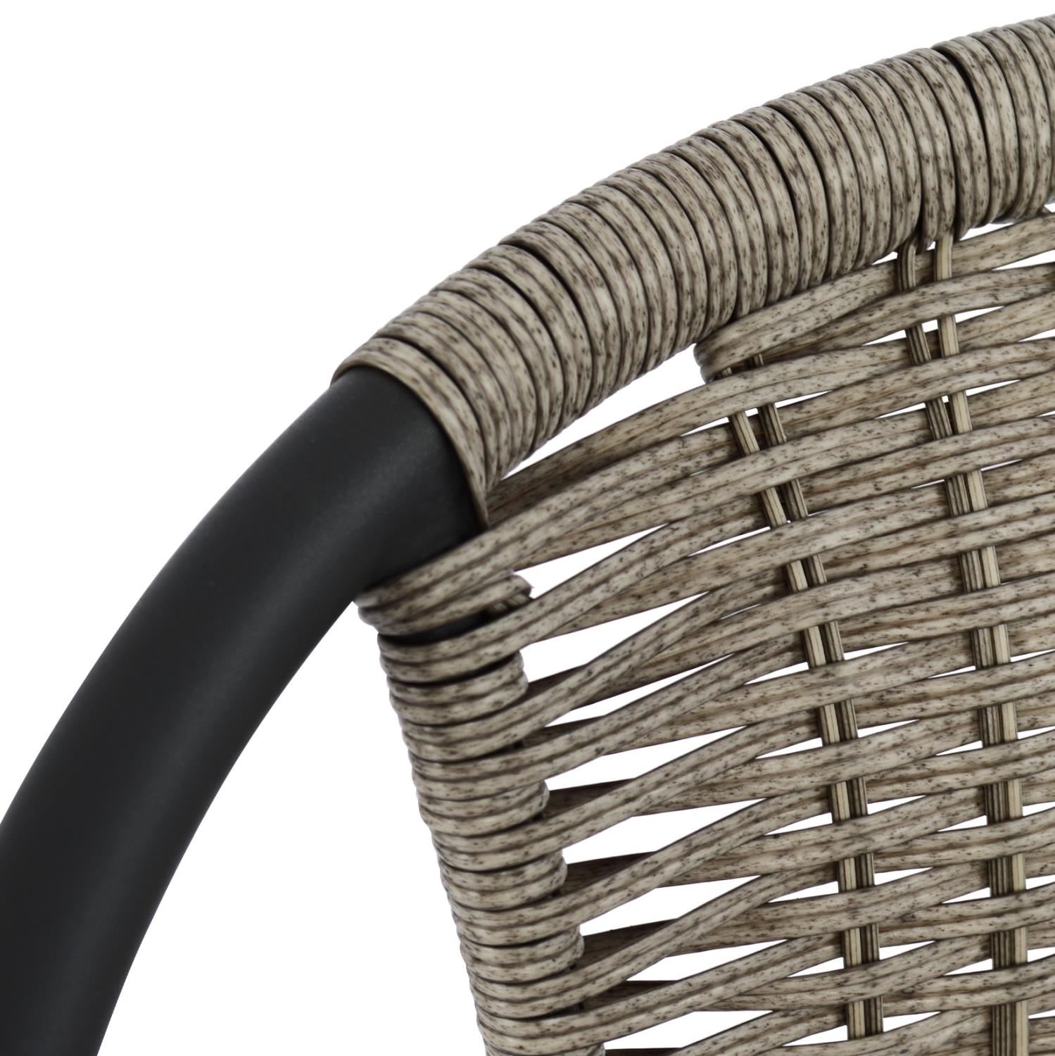 Η πλάτη και το κάθισμα είναι ντυμένα με πλεκτό συνθετικό υλικό wicker σε ανοιχτό γκρι χρώμα.