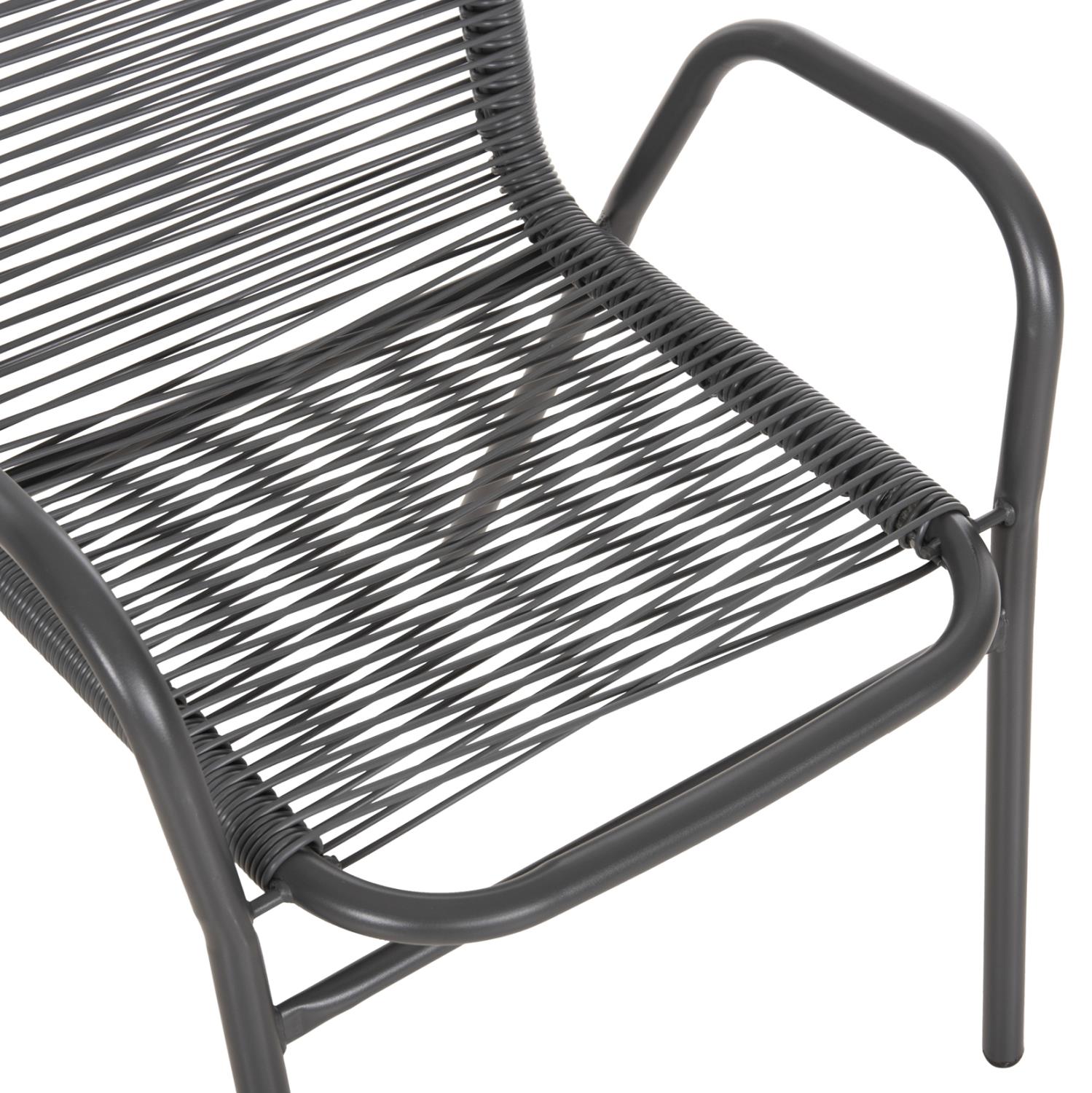 Αυτό το Σετ τραπεζαρίας εξωτερικού χώρου διαθέτει τραπέζι με ΓΚΡΙ μεταλλικό σκελετό και γυάλινη θολή ΕΝΙΣΧΥΜΕΝΗ επιφάνεια, και 4 μεταλλικές στοιβαζόμενες πολυθρόνες με κάθισμα & πλάτη από συνθετικό Rattan (σαν σχοινί) σε ΓΚΡΙ χρώμα.