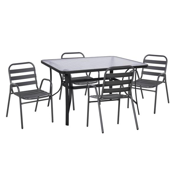 Σετ εξωτερικού χώρου με τραπέζι με ΓΚΡΙ μεταλλικό σκελετό και γυάλινη θολή ΕΝΙΣΧΥΜΕΝΗ επιφάνεια και 4 μεταλλικές πολυθρόνες με κάθισμα από φέτες αλουμινίου σε ΓΚΡΙ χρώμα.