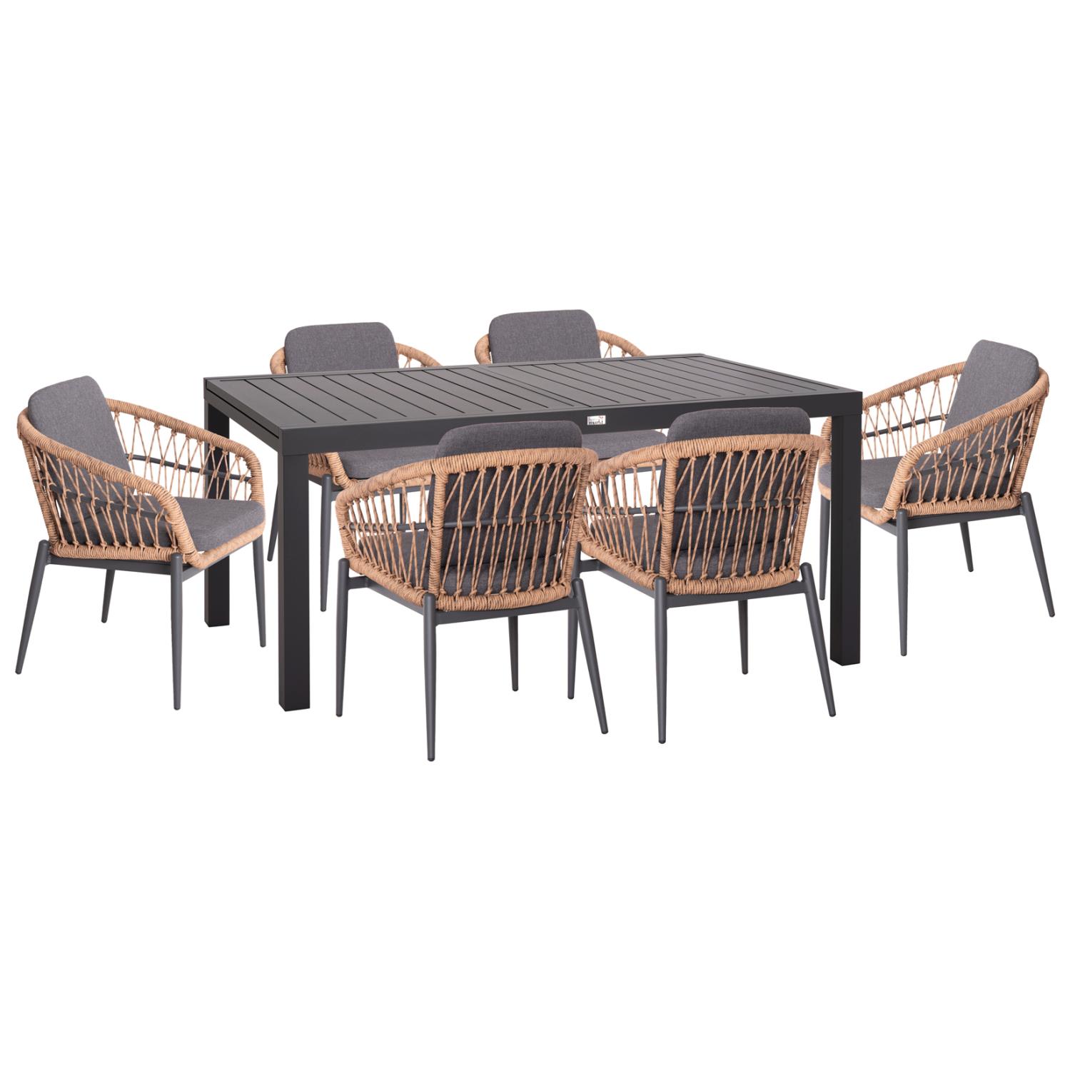 Αυτό το σετ τραπεζαρίας εξωτερικού χώρου KRUM C21157 αποτελείται από ένα ΣΚΟΥΡΟ ΓΚΡΙ επεκτεινόμενο τραπέζι αλουμινίου και 6 ΣΚΟΥΡO ΓΚΡΙ πολυθρόνες αλουμινίου με σκούρα ΓΚΡΙ μαξιλάρια και επένδυση από συνθετικό Rattan σε ΦΥΣΙΚΟ χρώμα.