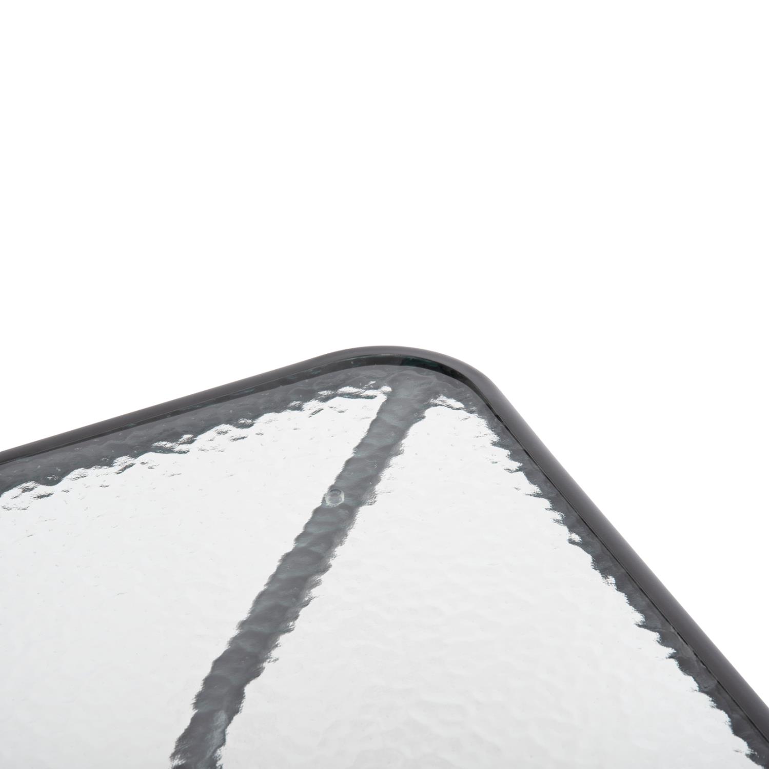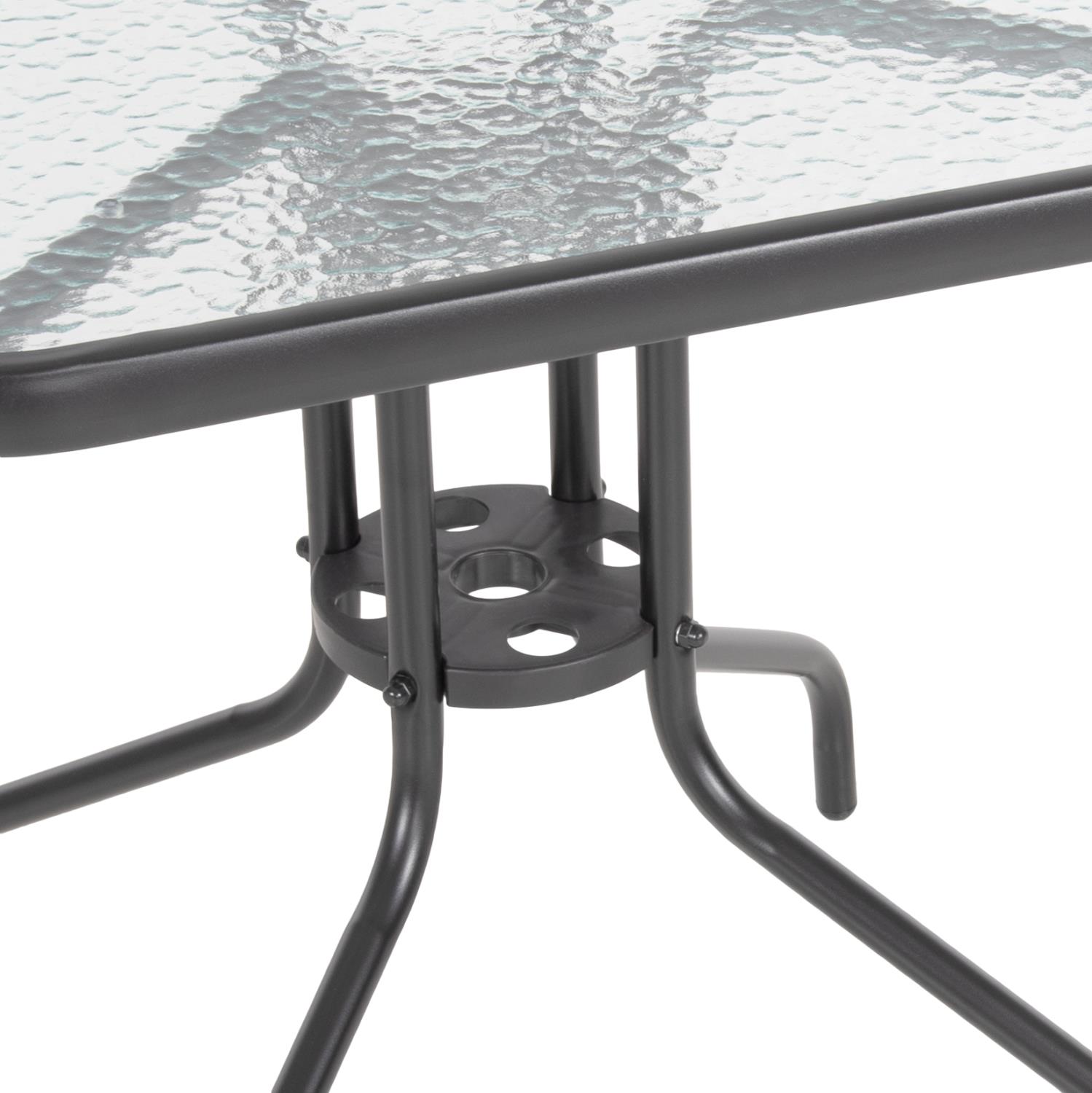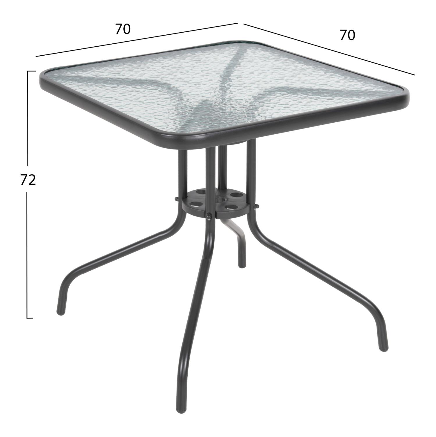 Ένα τραπέζι μεταλλικό εξωτερικού χώρου σε χρώμα γκρι-ανθρακί, με ενσωματωμένο τζαμί ασφάλειας (secure).