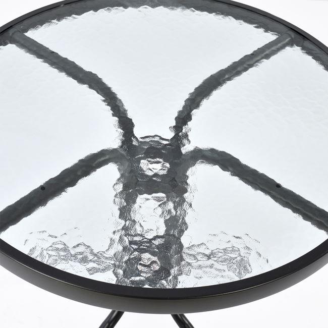 Ένα τραπέζι μεταλλικό εξωτερικού χώρου σε χρώμα γκρι-ανθρακί, με ενσωματωμένο τζαμί ασφάλειας (secure).