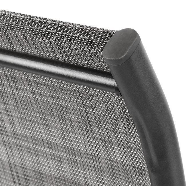 Δύο πολυθρόνες εξωτερικού χώρου από μεταλλικό σκελετό σε γκρι χρώμα με textilene 2x1 μεγάλης αντοχής σε ήλιο και βροχή.