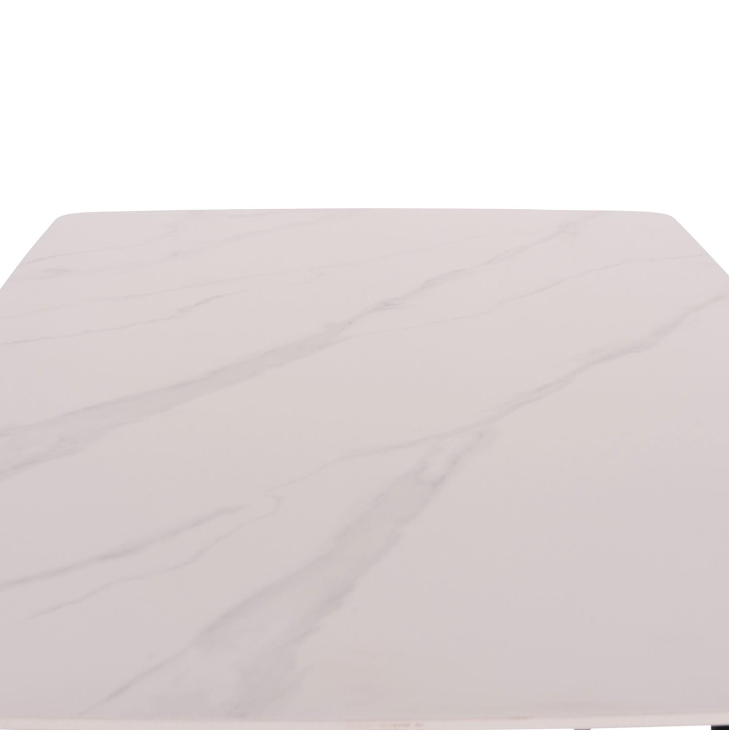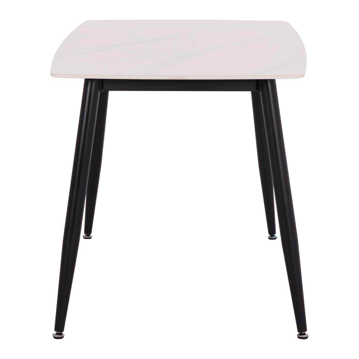 Ένα ορθογώνιο τραπέζι με σκελετό μεταλλικό σε ΜΑΥΡΟ χρώμα και κεραμική επιφάνεια με όψη ΛΕΥΚΟΥ ΜΑΡΜΑΡΟΥ, και 4 καρέκλες με ψηλή πλάτη και κάθισμα με επένδυση από βελούδινο ύφασμα σε χρώμα ΚΥΠΑΡΙΣΣΙ και μεταλλικό σκελετό σε ΜΑΥΡΟ χρώμα.