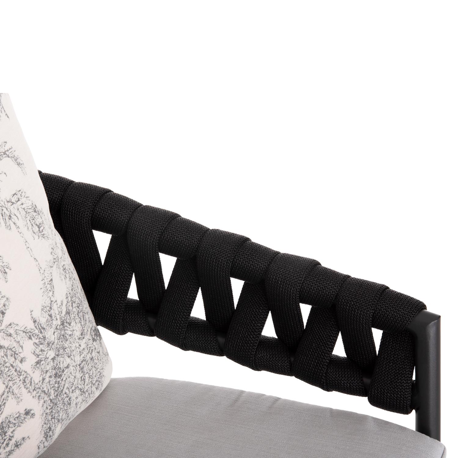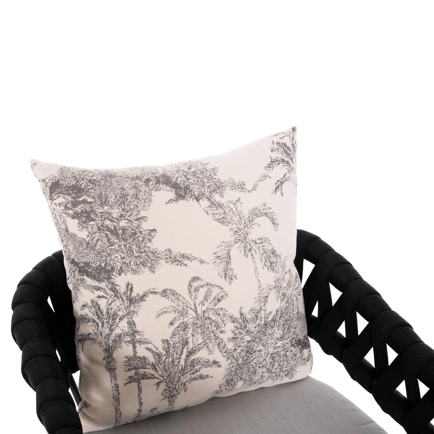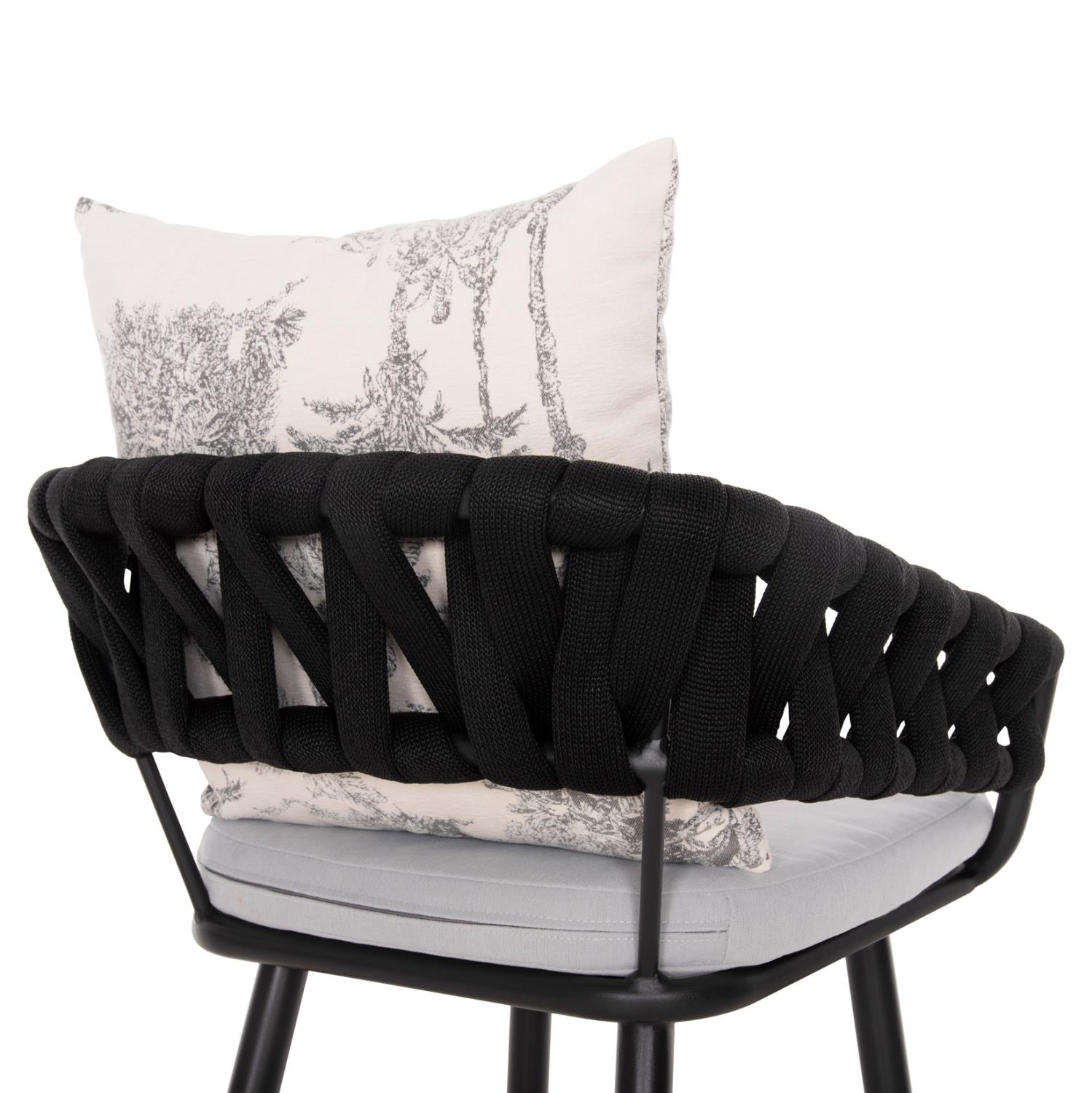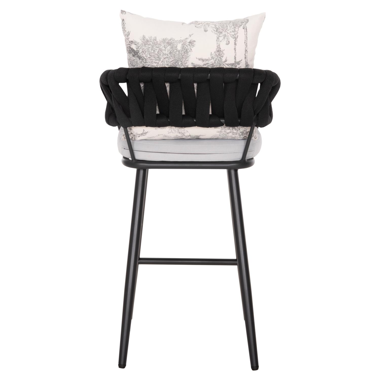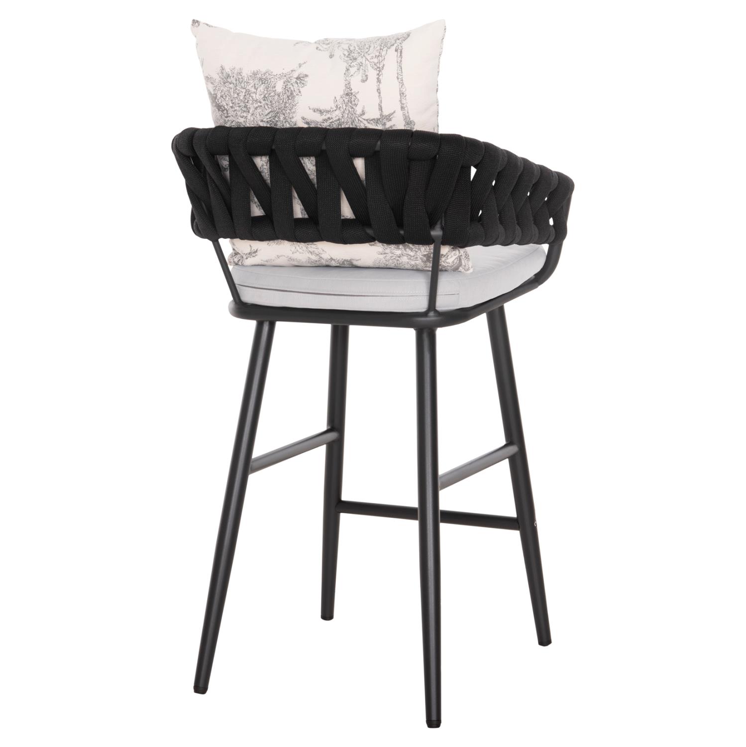Το σκαμπό μπαρ αλουμινίου CAMDEN σε ΑΝΘΡΑΚΙ χρώμα δεν έχει ξεχωριστά μπράτσα αλλά η πλάτη είναι ημικυκλική αγκαλιάζοντας το σώμα. Πρόκειται για ένα ξεχωριστό σκαμπό με χαμηλή πλάτη από συνθετικό φαρδύ πολυεστερικό σχοινί (terylene). Το ιδιαίτερο χαρακτηριστικό αυτού του σκαμπό είναι ότι διαθέτει αναπαυτικά μαξιλάρια (με φερμουάρ) τόσο στο κάθισμα σε ΛΕΥΚΟ χρώμα, όσο και στην πλάτη σε ΕΚΡΟΥ χρώμα με PRINT σχέδιο.