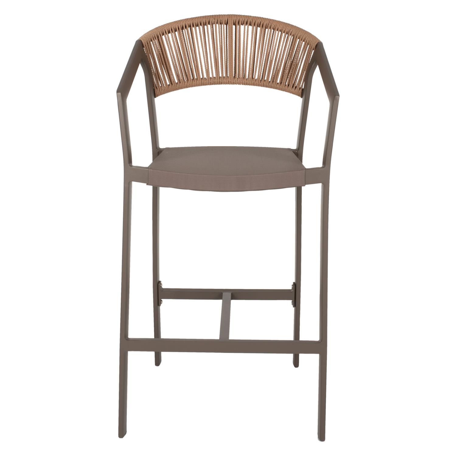 Η πλάτη του σκαμπό είναι επενδυμένη με πολυεστερικό RATTAN. Στα περισσότερα έπιπλα κήπου και γενικά σε έπιπλα για εξωτερικούς χώρους χρησιμοποιείται συνθετικό υλικό από PVC, δηλαδή τεχνητές ίνες υψηλής ποιότητας. Αυτό δίνει στην κατασκευή εξαιρετική αντοχή και ανθεκτικότητα σε ακραίες συνθήκες ζέστης ή κρύου.