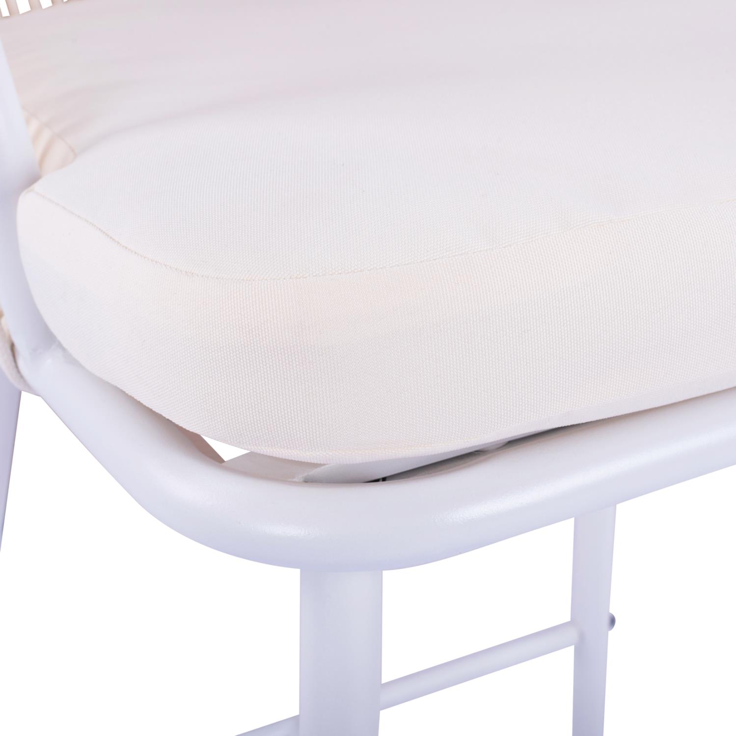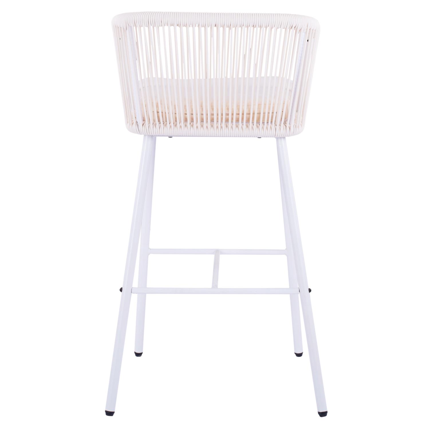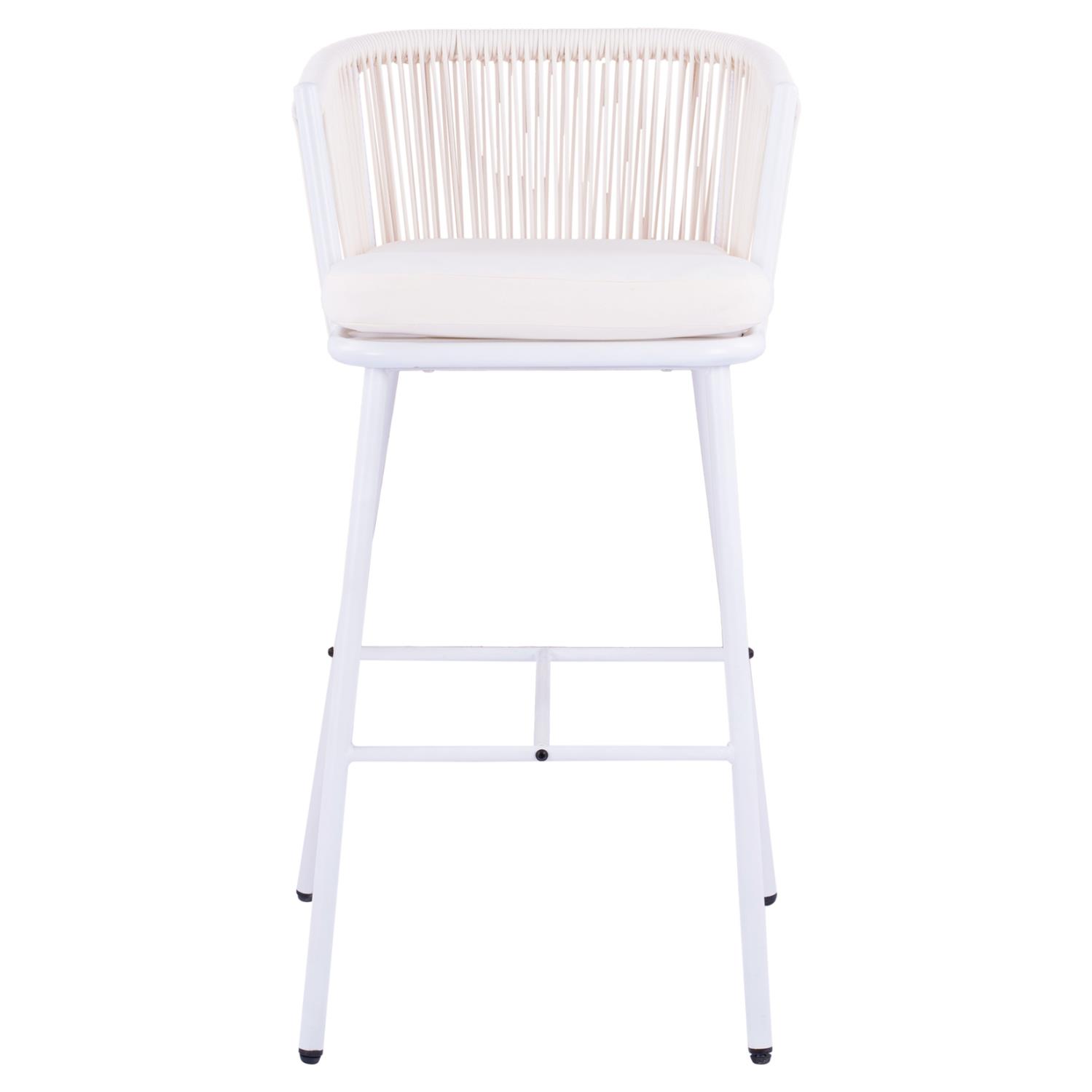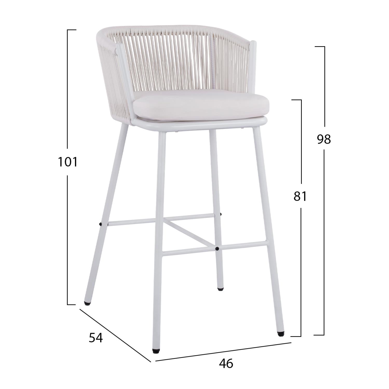 Μοντέρνο σκαμπό BROGAN με πλάτη και μαξιλάρι, εξωτερικού αλλά και εσωτερικού χώρου, κατασκευασμένο από μεταλλικό σκελετό σε λευκή απόχρωση, επενδυμένο με πλεκτό σχοινί σε λευκή απόχρωση.