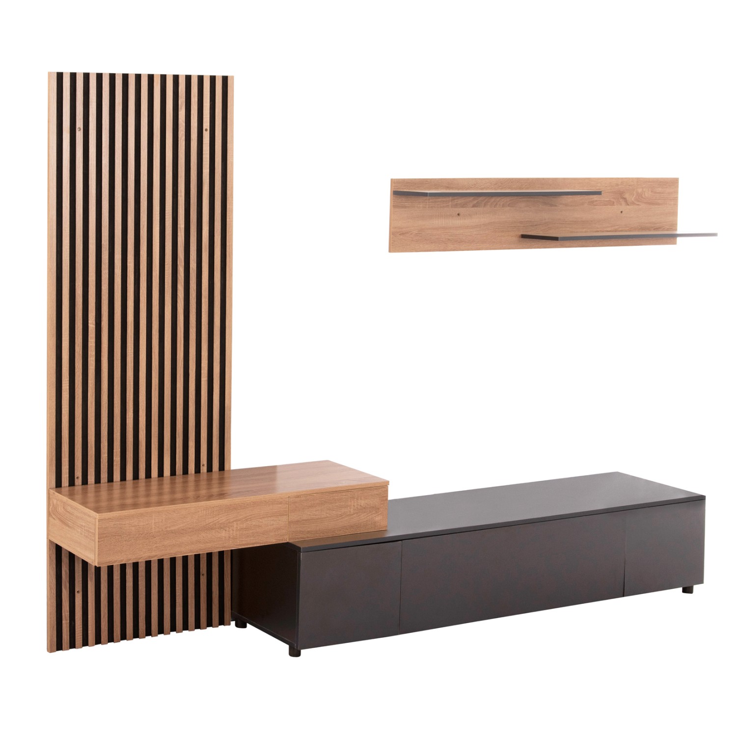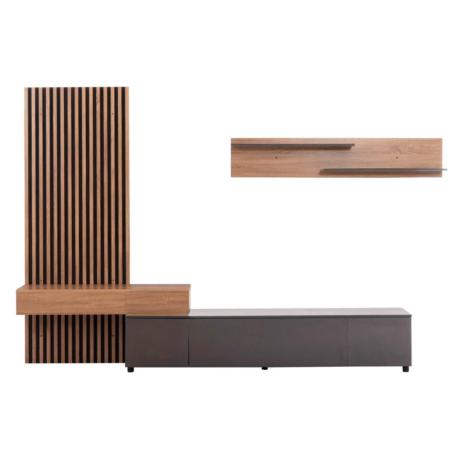 Η σύνθεση επίπλου για την τηλεόραση DORT είναι μια μοντέρνα πρόταση σε ΣΚΟΥΡΟ ΓΚΡΙ και ΣΟΝΑΜΑ χρώμα, που θα ομορφύνει το σαλόνι σας! Αποτελείται από μια διακοσμητική «πλάτη», έναν επιτοίχιο συνδυασμό με 2 ραφάκια στο επάνω μέρος και το κυρίως έπιπλο δαπέδου. Το design είναι σε μοντέρνα γραμμή και είναι σίγουρο ότι οι αποθηκευτικοί χώροι θα εντυπωσιάσουν και τους πιο δύσκολους, τόσο στην όψη όσο και με την πρακτικότητά τους.