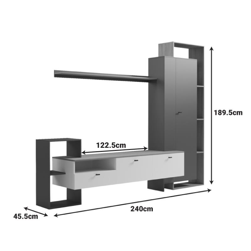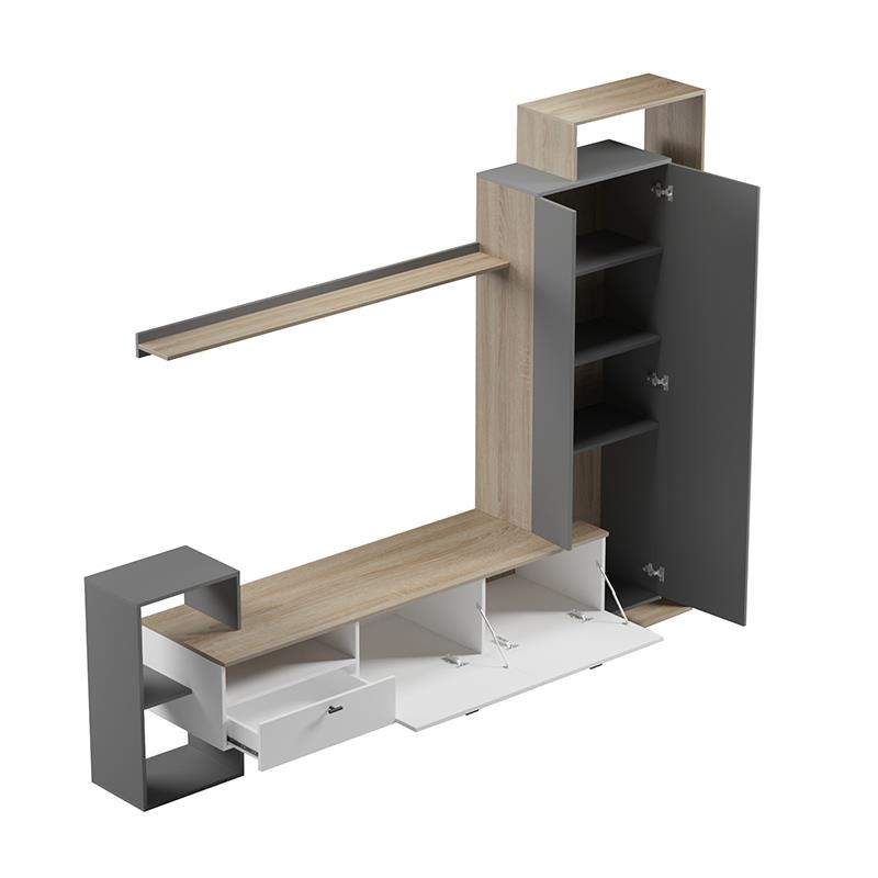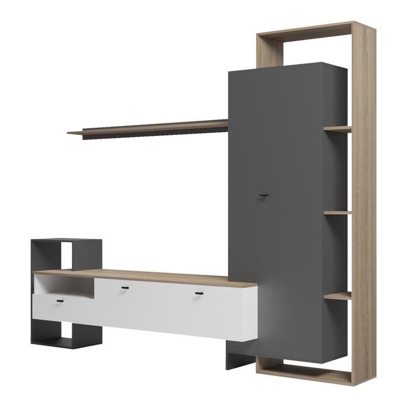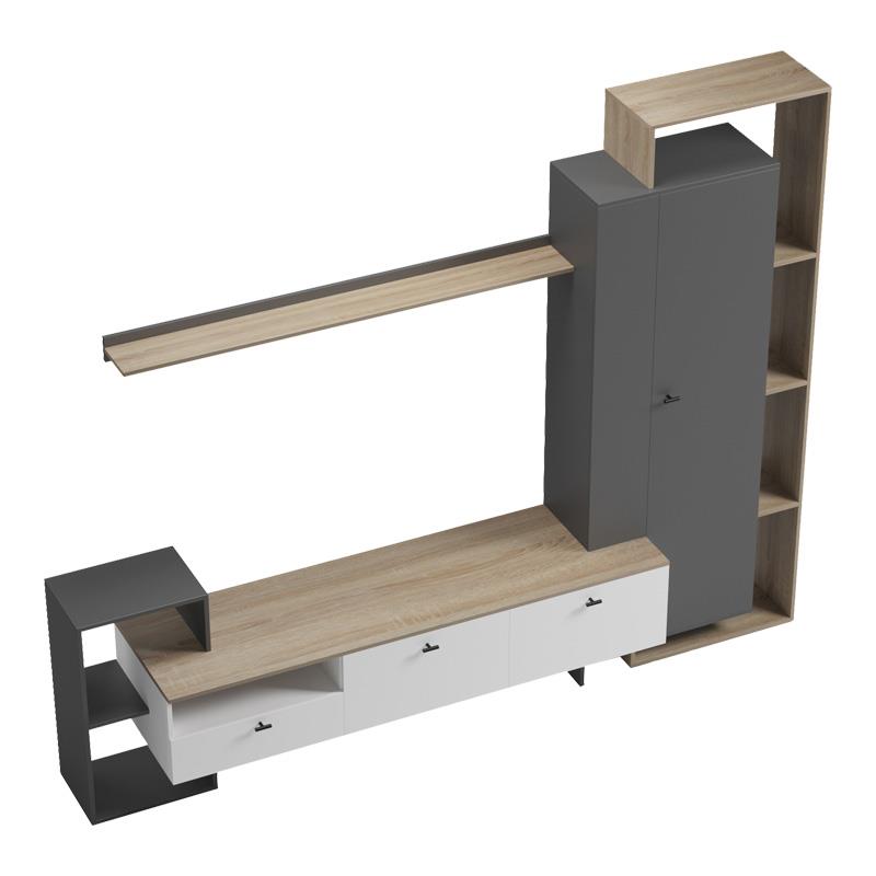 Δημιουργήστε τον ιδανικό χώρο ψυχαγωγίας και χαλάρωσης στο σαλόνι σας με το σύνθετο Ferefia! Αυτό το εντυπωσιακό, πολυτελές σύνθετο συνδυάζει έξυπνα αποθηκευτικούς χώρους με μοντέρνο design τη ζεστασιά του sonoma χρώματος, την κομψότητα του γκρι και τη φωτεινότητα του λευκού.